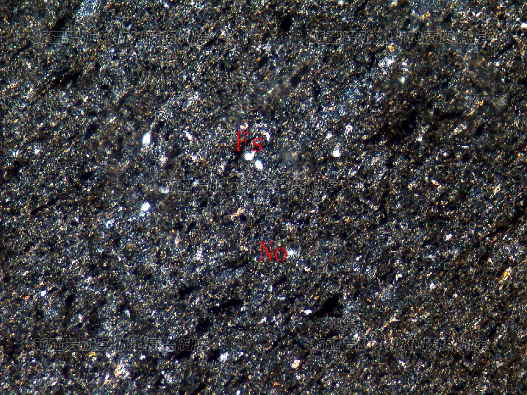 岩石由少量的石英粉砂(Fs)和粘土矿物(No)集合体构成,其中含较多的碳质,也可见少量的细黄铁矿。