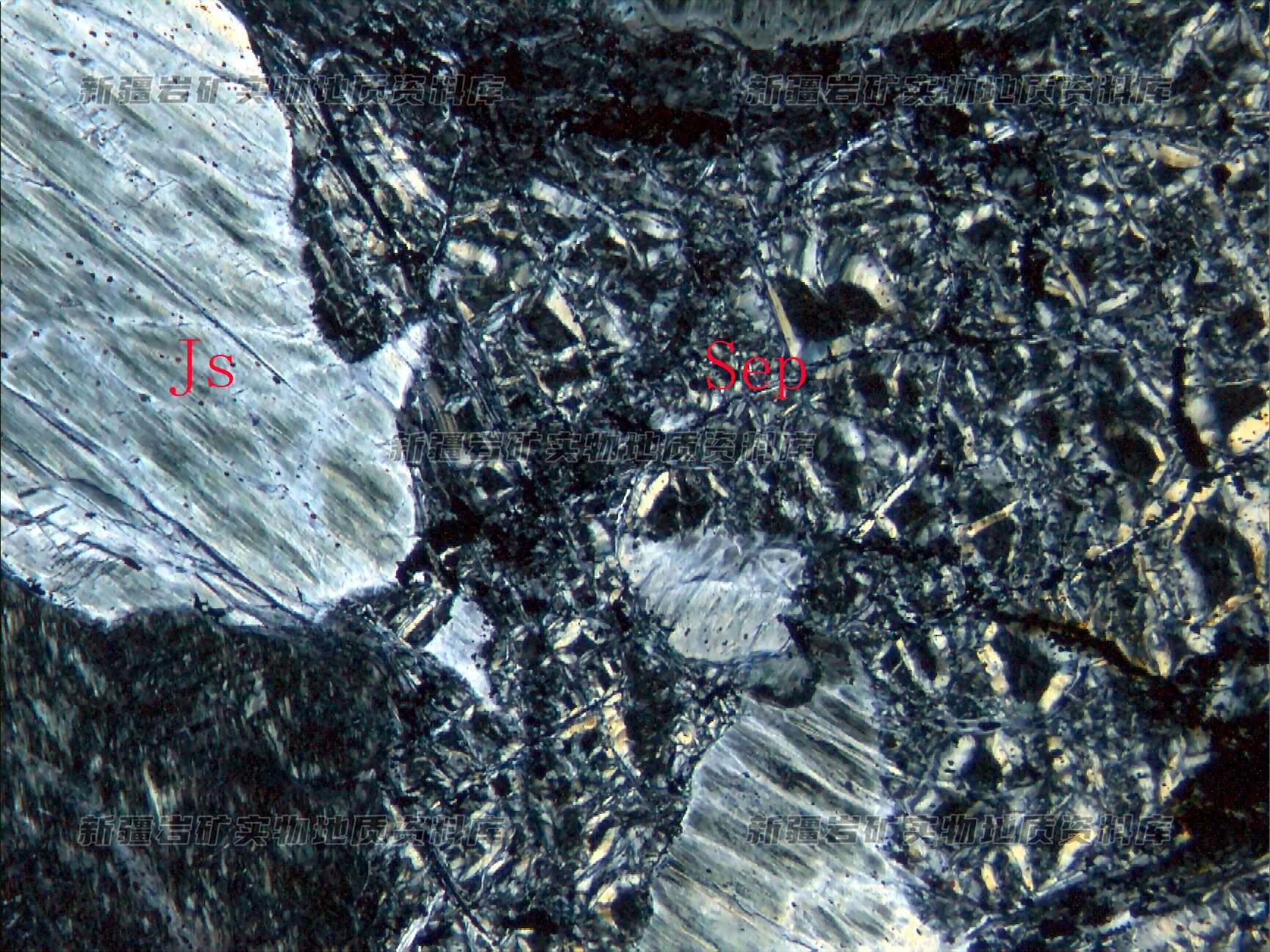 岩石全部由次生蚀变形成的蛇纹石(Sep)集合体构成,并析出有细粒磁铁矿,镜下可见保留辉石外形的绢石(Js)。