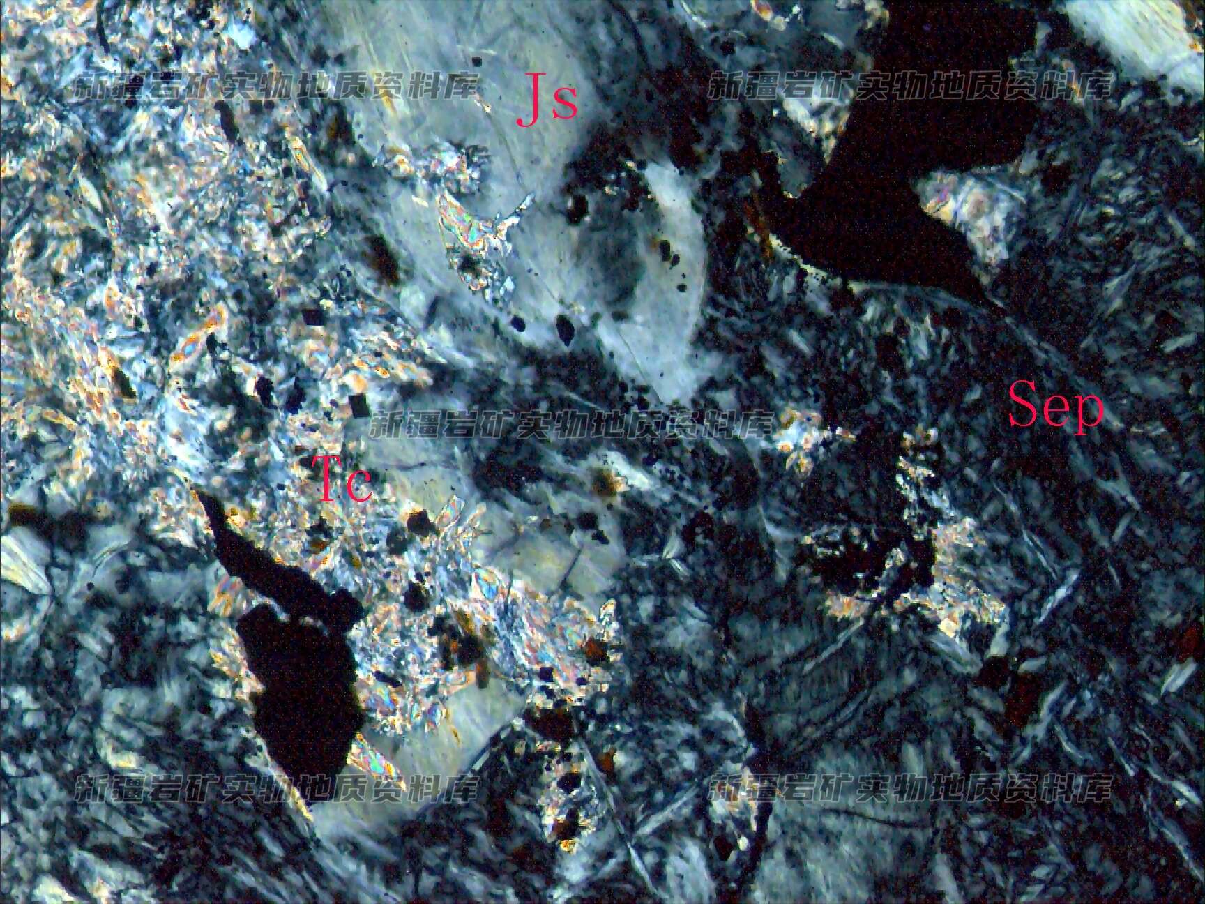 岩石由次生蚀变矿物蛇纹石(Sep)、滑石(Tc)及细粒磁铁矿等构成,镜下可见绢石(Js),滑石叠加蛇纹石之上,形成较晚。