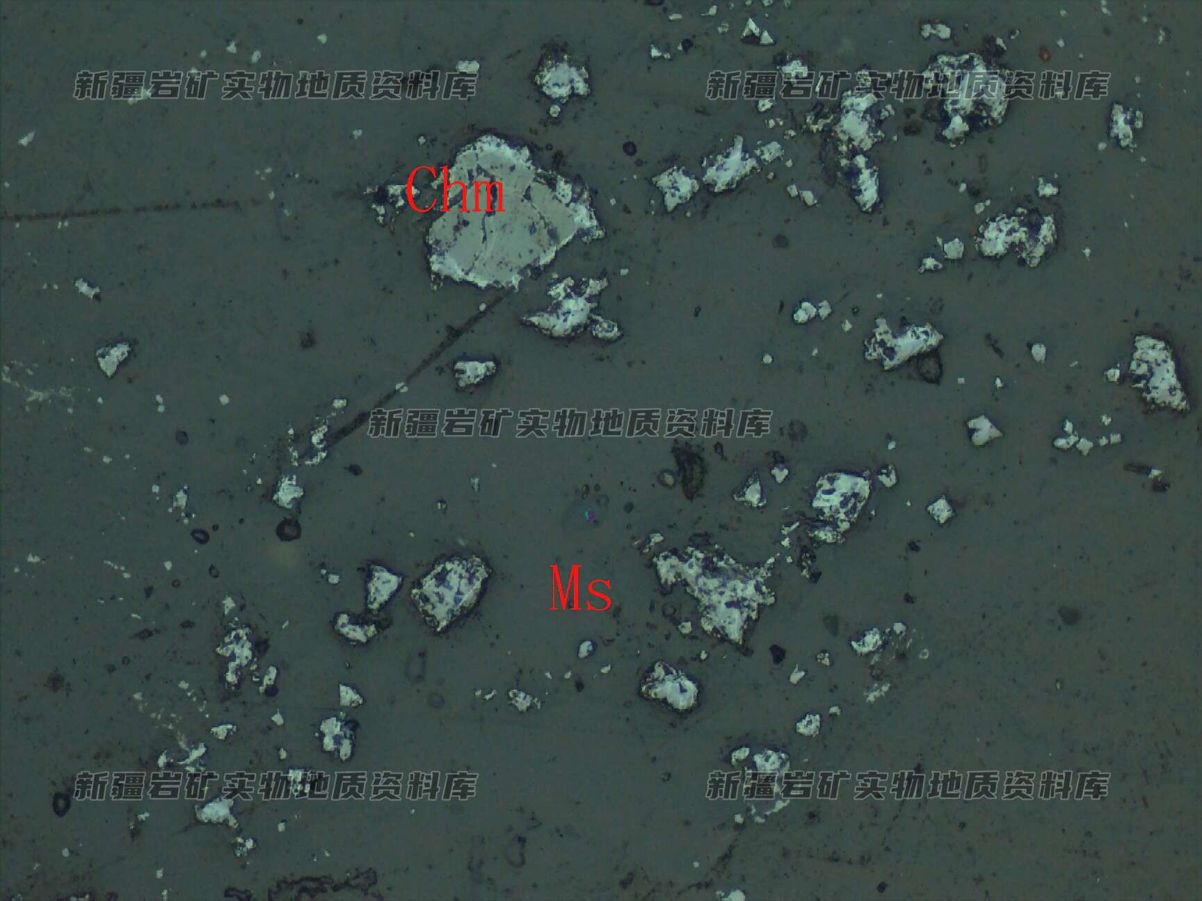 金属矿物为铬铁矿(Chm),呈半自形粒状分布在脉石矿物(Ms)之间,并具磁铁矿交代环边。