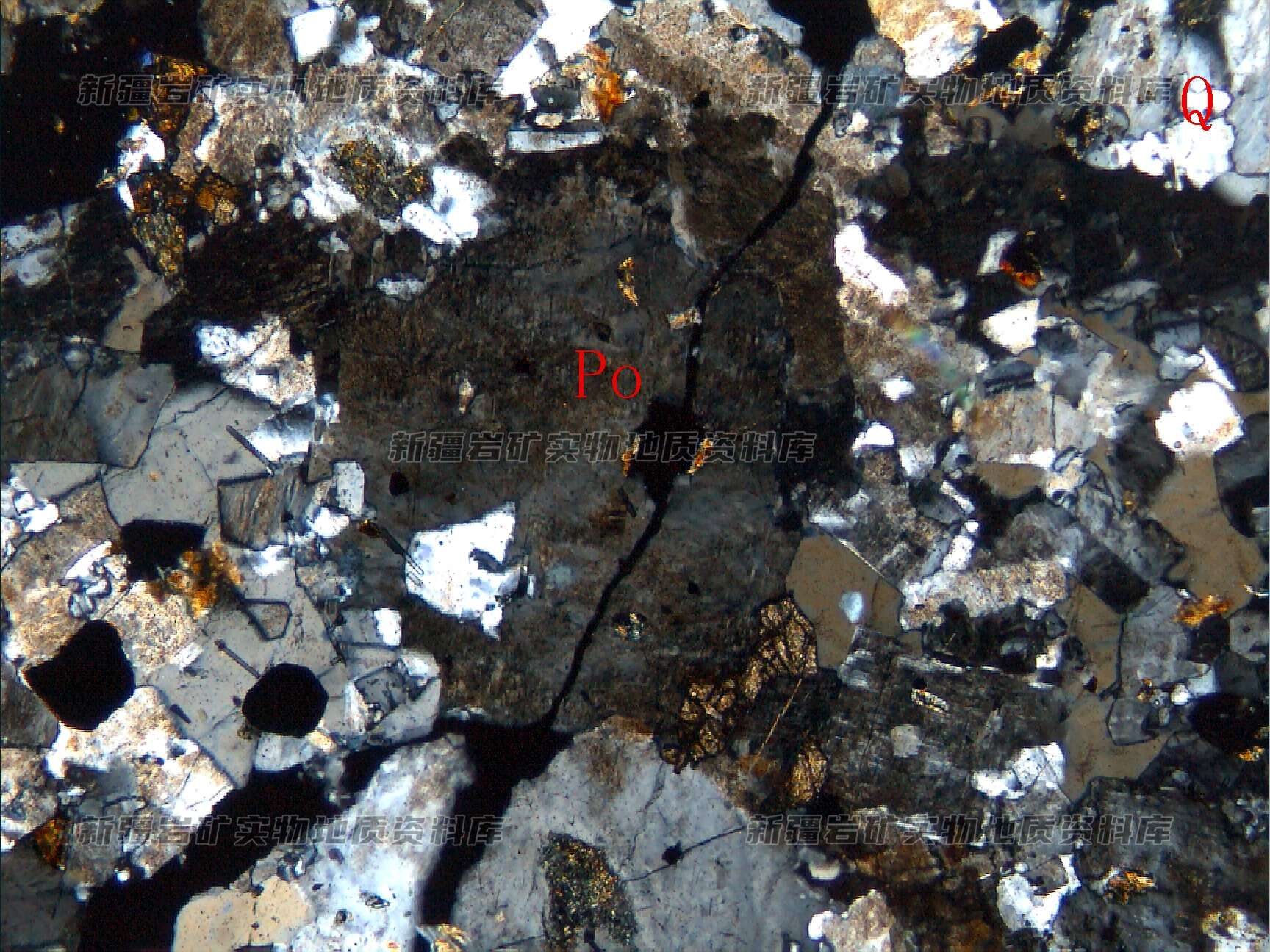 斑晶为钾长石(Po)呈他形-半自形粒状分布,基质由细粒的钾长石(Po)、石英(Q)等构成,彼此连生在一起。