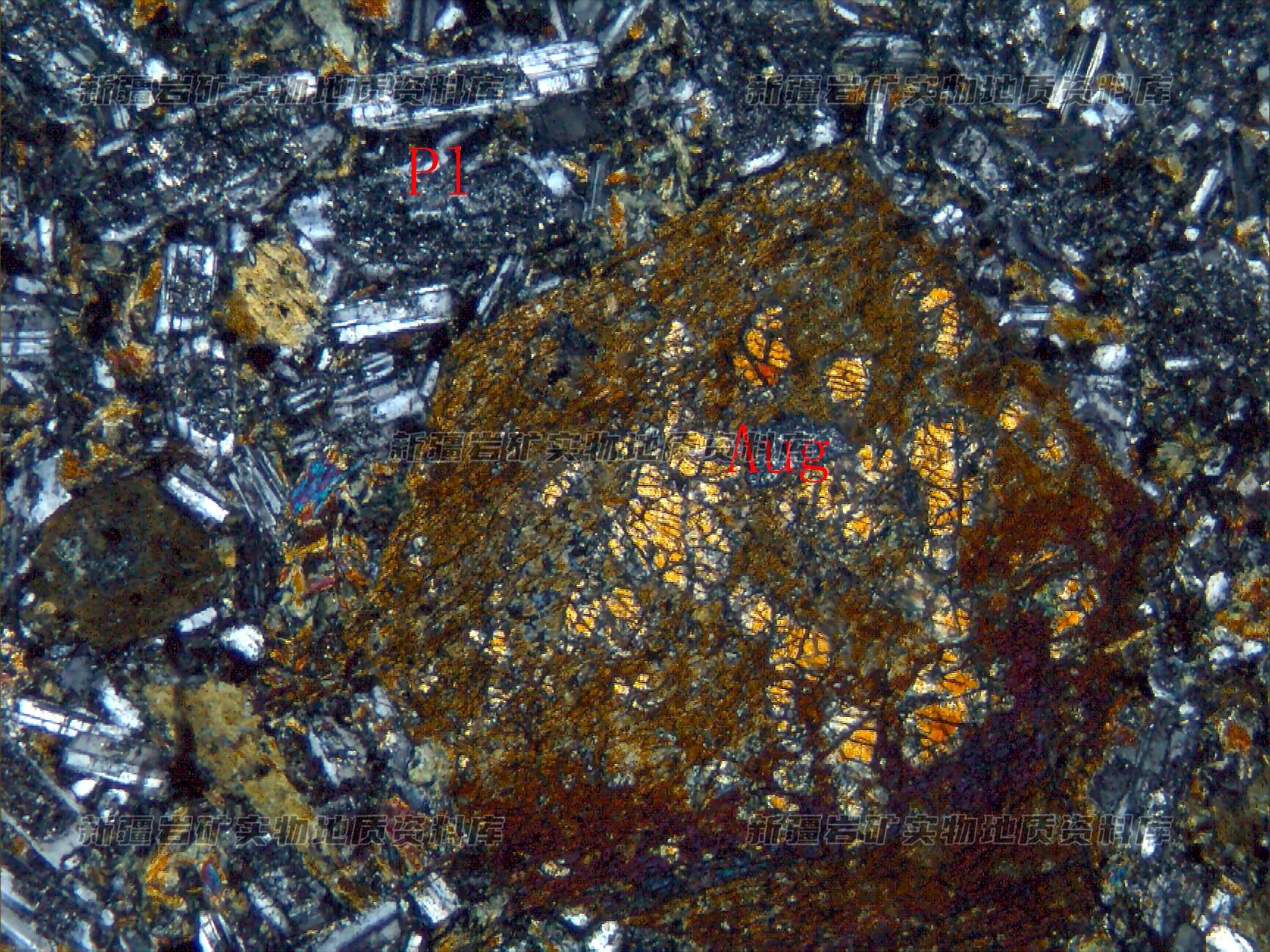 岩石由普通辉石(Aug)、斜长石(Pl)斑晶和基质两部分构成,辉石斑晶多数已被阳起石交代,仅呈残余体存在,基质由板条状细粒斜长石(Pl)、辉石及磁铁矿等构成,长石具环带构造。