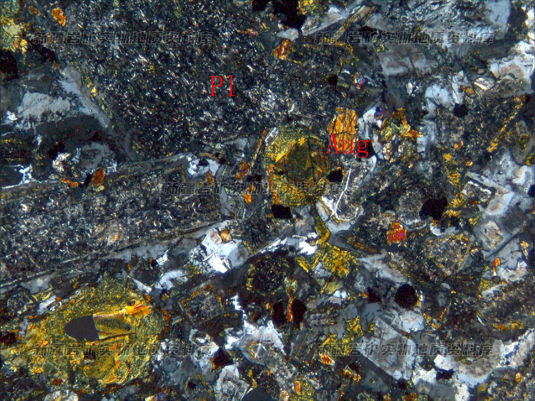 斑晶为斜长石(Pl),呈半自形板状分布,表面泥化严重,基质由粒径较细的斜长石(Pl)、辉石(Aug)、磁铁矿等构成,辉石多已绿泥石化。
