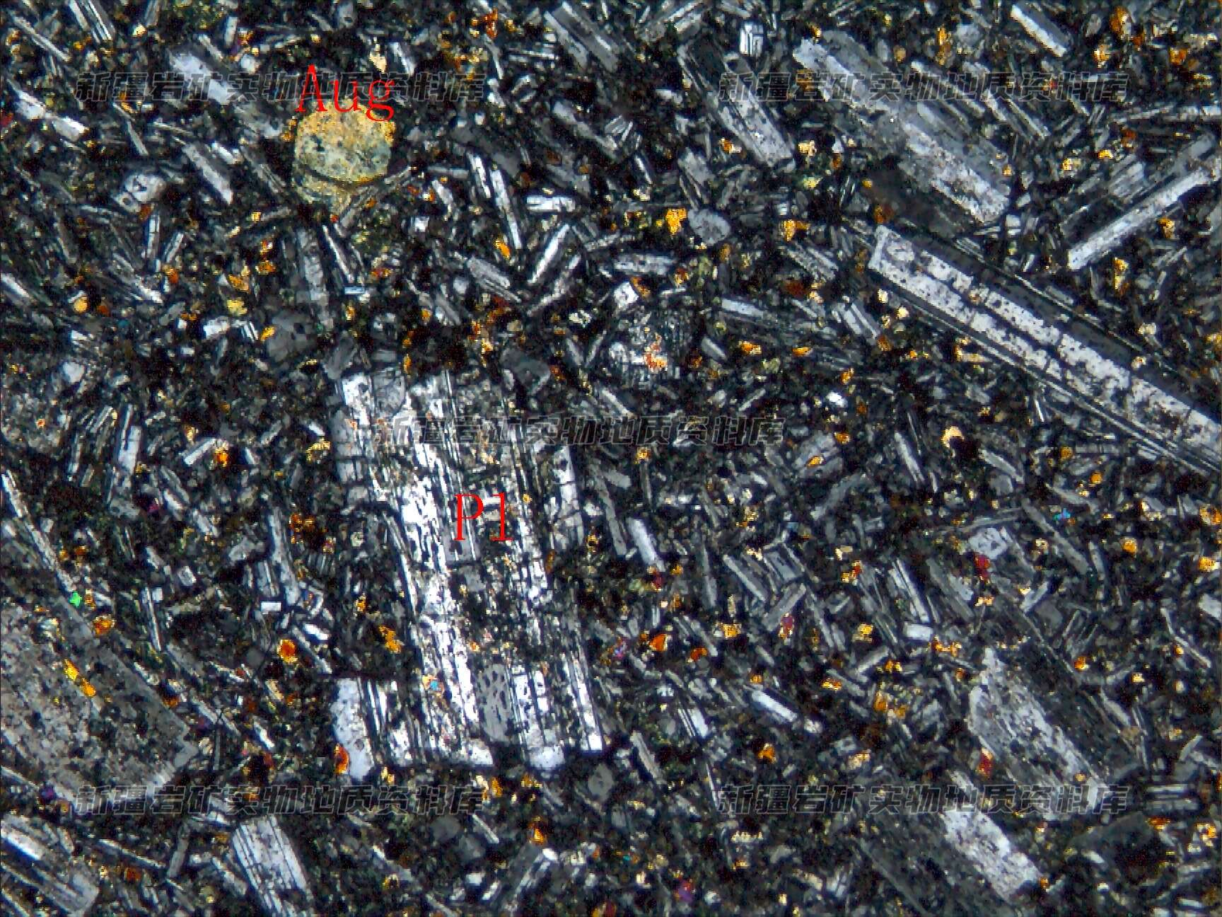斑晶为斜长石(Pl),呈半自形板条状分布。基质由板条状微晶斜长石和辉石(Aug)及磁铁矿等构成,长石微晶呈架状-半定向分布。