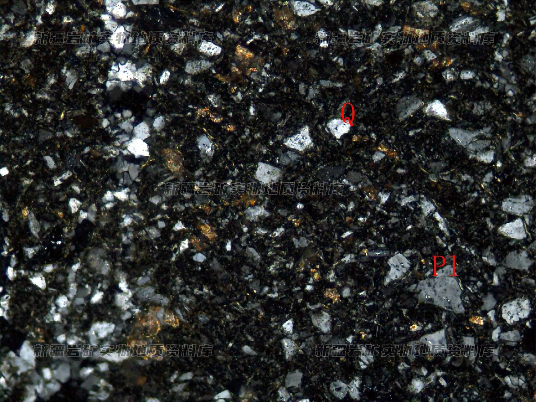 岩石由碎屑、玻屑及火山灰尘等组成,碎屑为长石(Pl)和石英(Q),火山灰尘完全脱玻化为绿泥石及长英集合体,岩石有明显碎裂,沿裂隙充填石英脉。