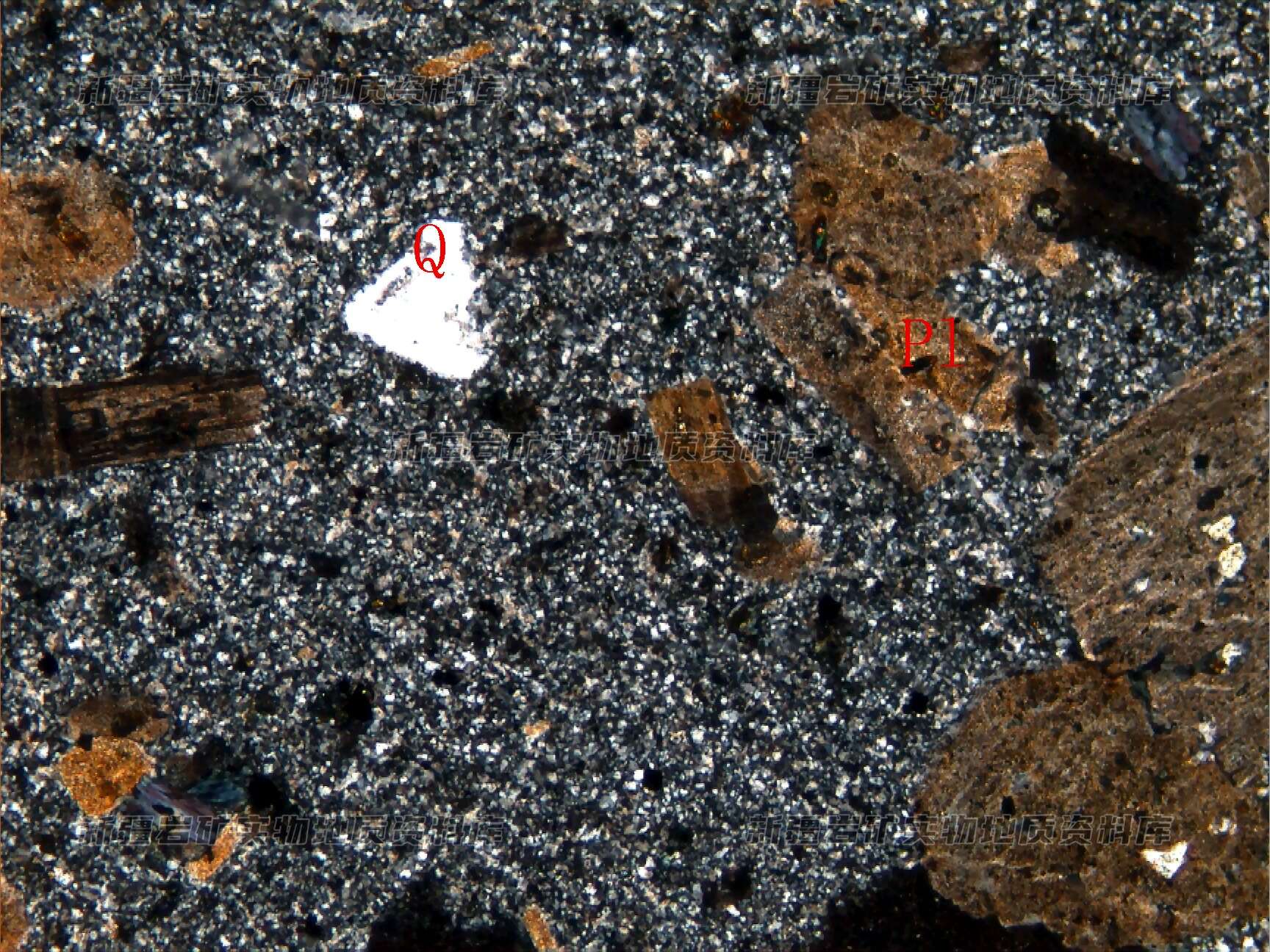 岩石具斑状结构,斑晶多为斜长石(Pl)、石英(Q)及钾长石等,长石泥化严重,基质由细粒长石、石英集合体构成。