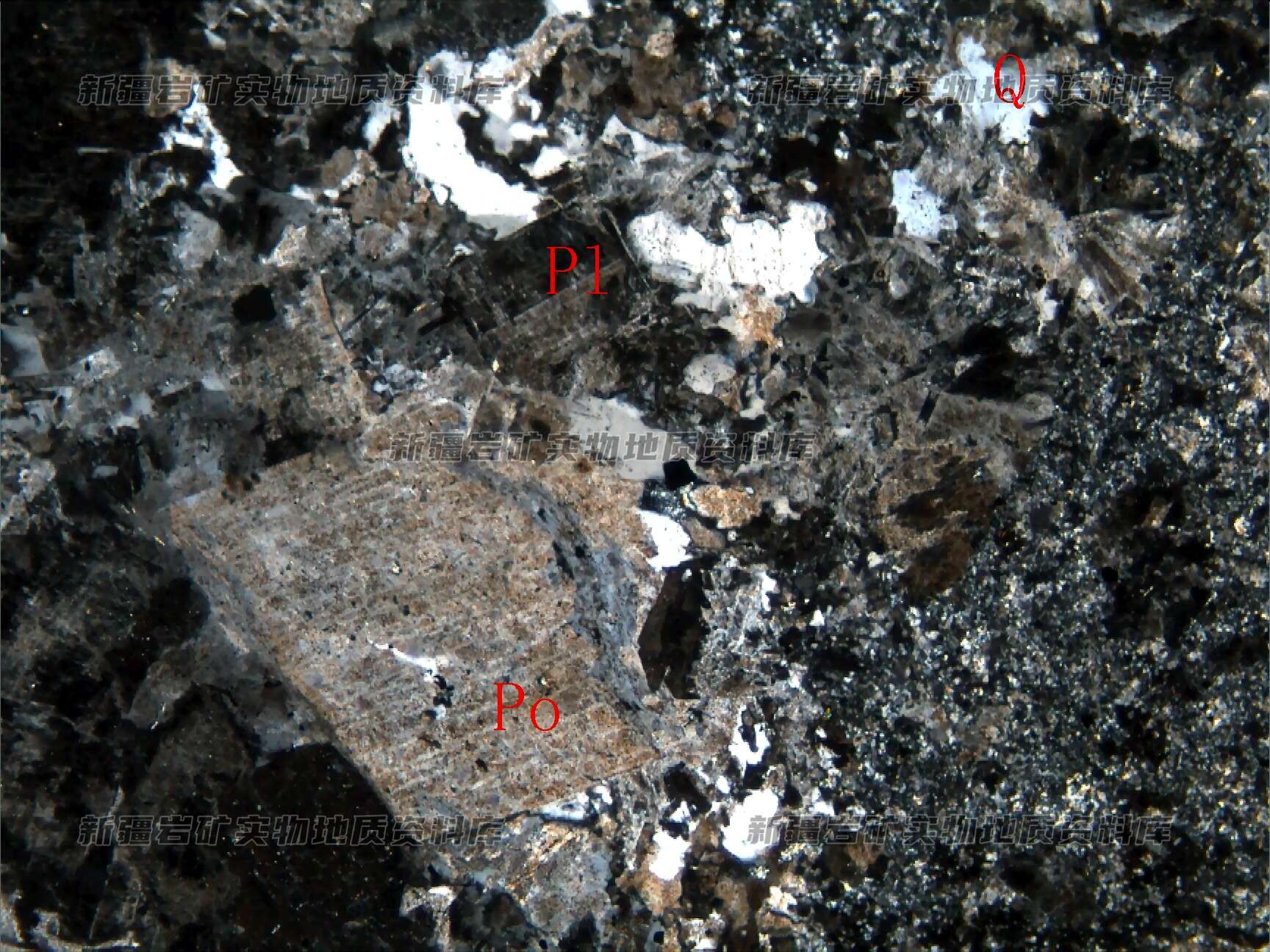 斑晶多为斜长石(Pl)、石英及钾长石(Po),长石具轻度泥化,基质具微粒结构,由斜长石、石英及钾长石集合体构成。