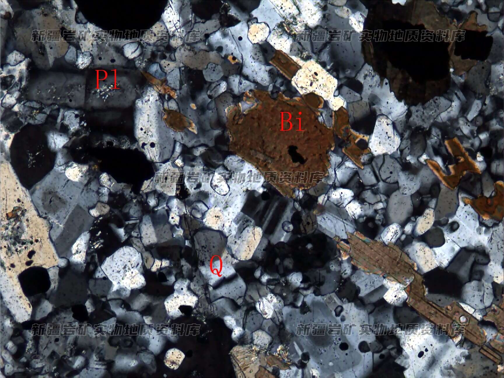岩石由斜长石(Pl)、石英(Q)及黑云母(Bi)等构成,各矿物颗粒大小明显不一,与同化混染作用(?)有关。
