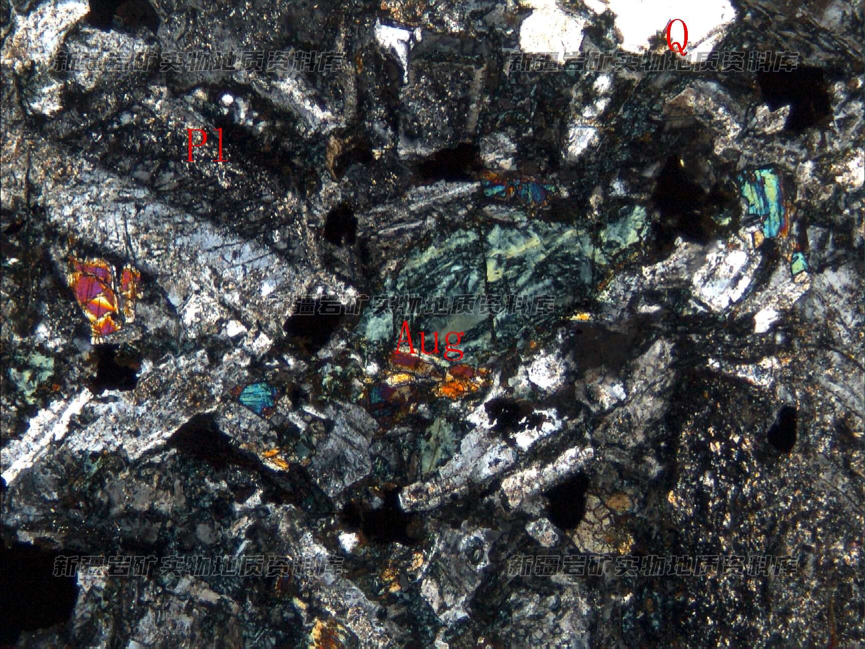 斑晶主要为斜长石(Pl)和少量普通辉石(Aug),长石表面具黝帘石化和绢云母化,基质由细粒辉石和斜长石等构成。