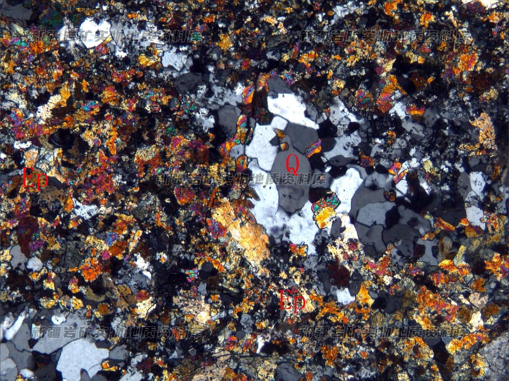 岩石全部次生蚀变形成的石英(Q)和绿帘石(Ep)等矿物构成,属于热液产物。