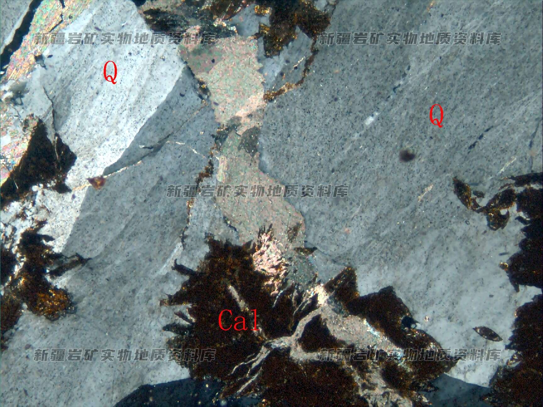 由铁方解石(Cal)和石英(Q)构成,石英呈他形粗粒状分布,铁方解石半自形粒状集合体,并交代石英。此外,还存在更晚期的方解石脉。