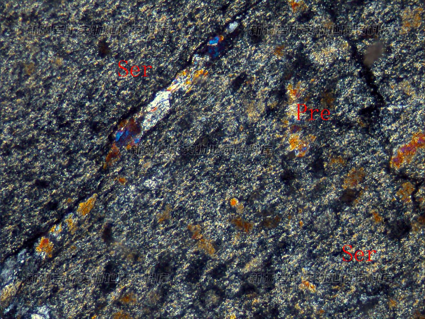 岩石中的主要矿物为绢云母(Ser),次有少量的硅质,后期叠加较强的葡萄石化(Pre),绢云母呈鳞片状集合体定向分布。