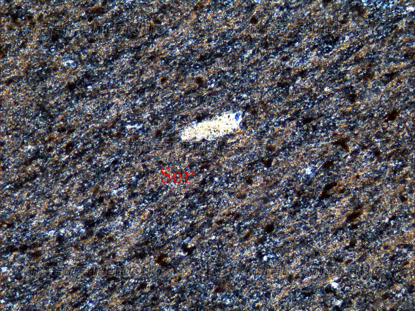 岩石主要由绢云母(Ser)及隐晶质石英等构成,其中混有少量的长石、石英碎屑,绢云母定向分布。