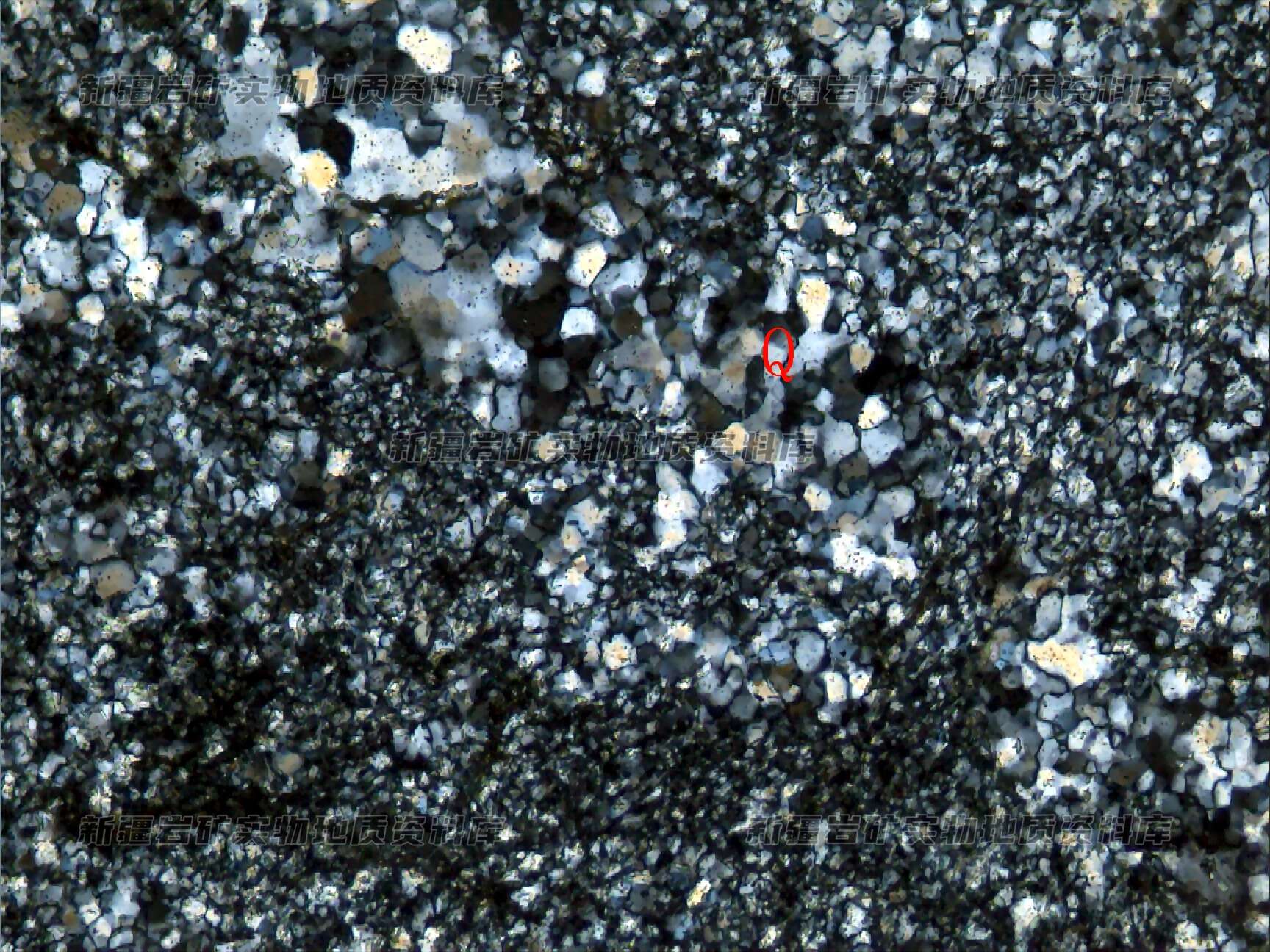 岩石中矿物主要为石英(Q),呈细粒集合体分布,其间分布一些粘土矿物及黑云母等。