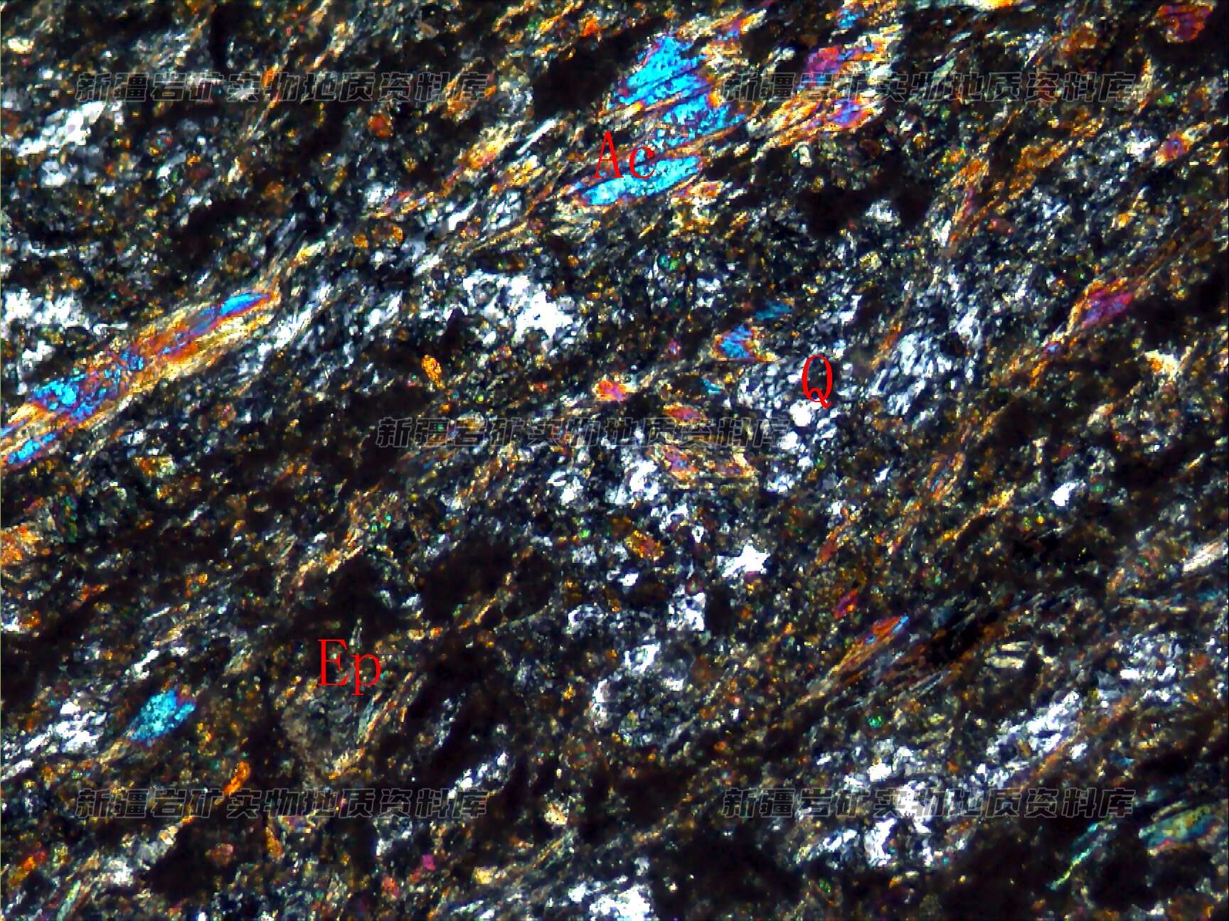 岩石由石英(Q)、阳起石(Ac)和绿帘石(Ep)等构成,其次含有一些白钛石,阳起石柱状,定向分布,原岩难恢复。