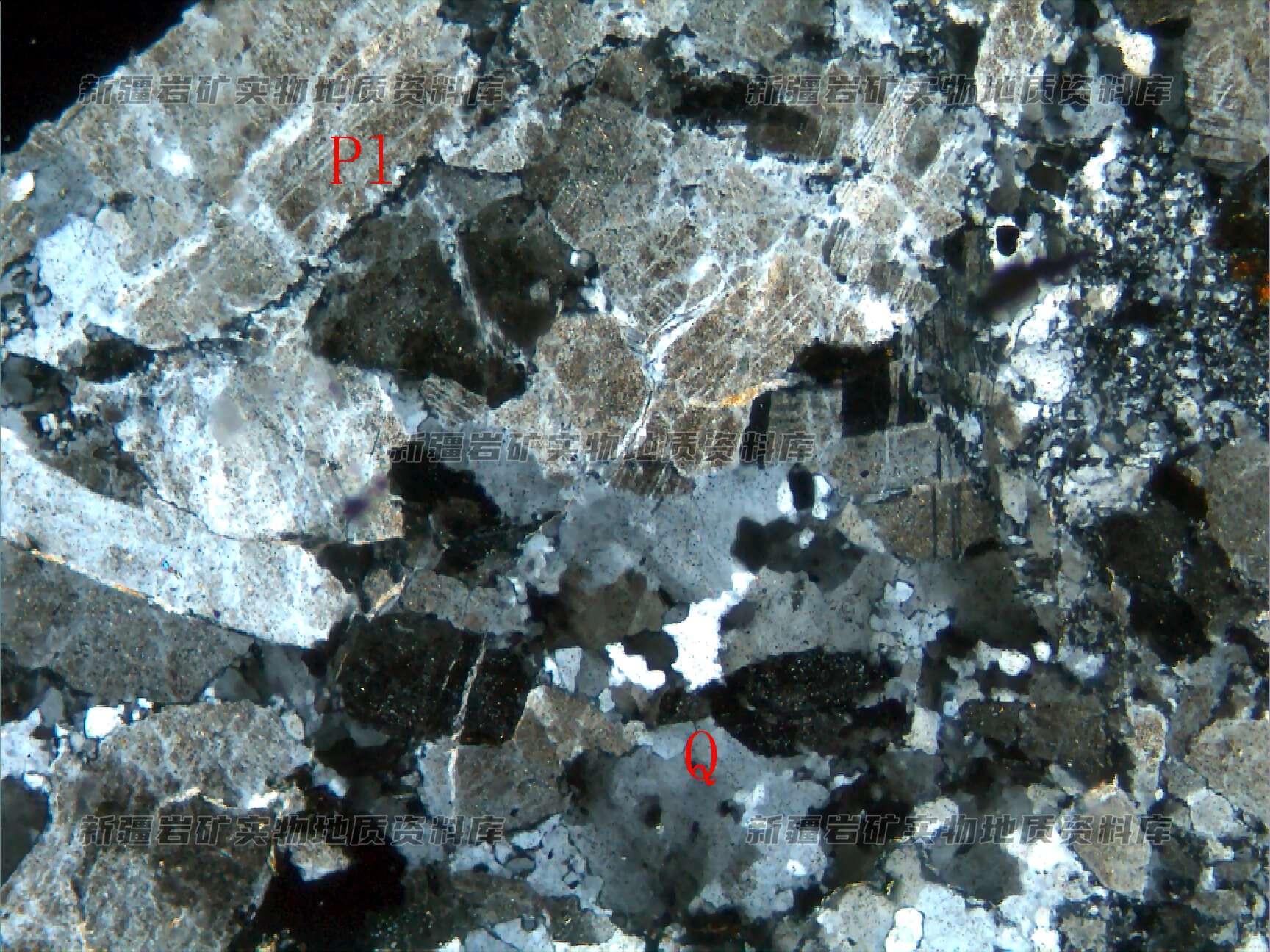 岩石主要由斜长石(Pl)和石英(Q)构成,斜长石为钠-更长石,见聚片双晶,岩石受应力作用影响,产生破碎。