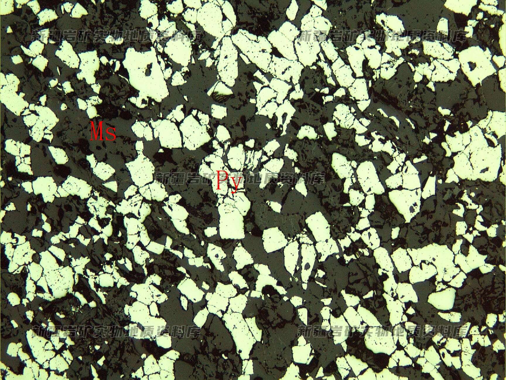 金属硫化物仅为黄铁矿(Py),半自形粒状,呈中等浸染状分布在脉石矿物(Ms)粒间。