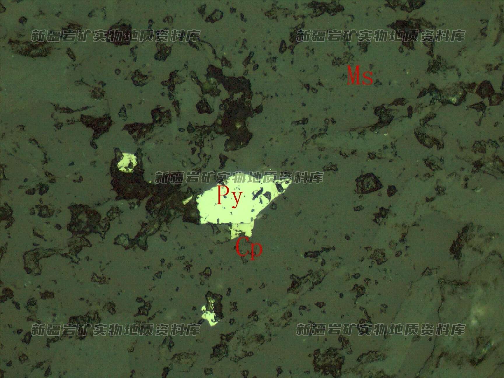 金属硫化物为黄铜矿(Cp)和黄铁矿(Py),含量低,呈他形-半自形粒状分布在脉石矿物(Ms)粒间。