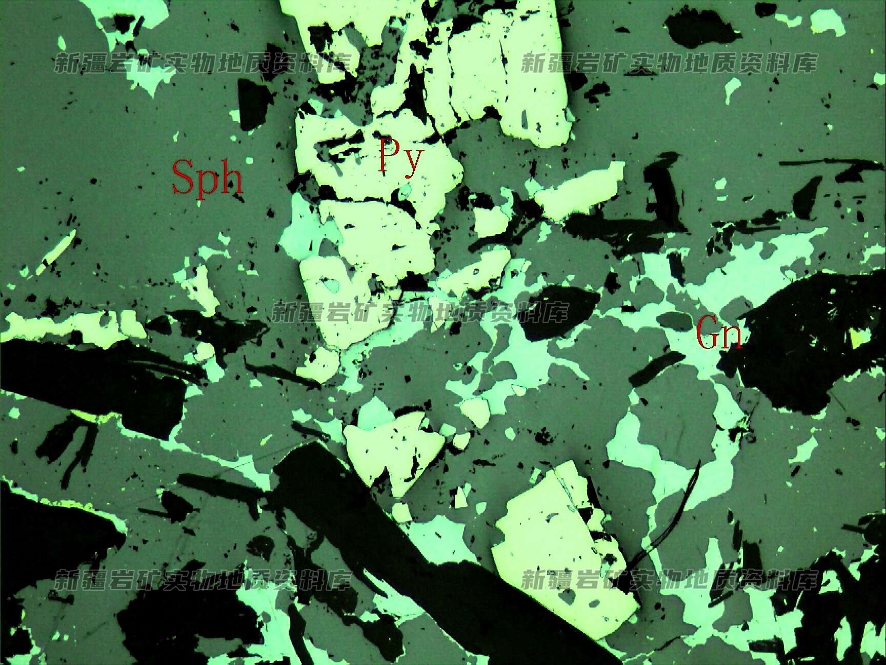 方铅矿(Gn)交代黄铁矿(Py)或分布在闪锌矿(Sph)裂隙、粒间,并交代闪锌矿,黄铜矿多与方铅矿连生在一起。