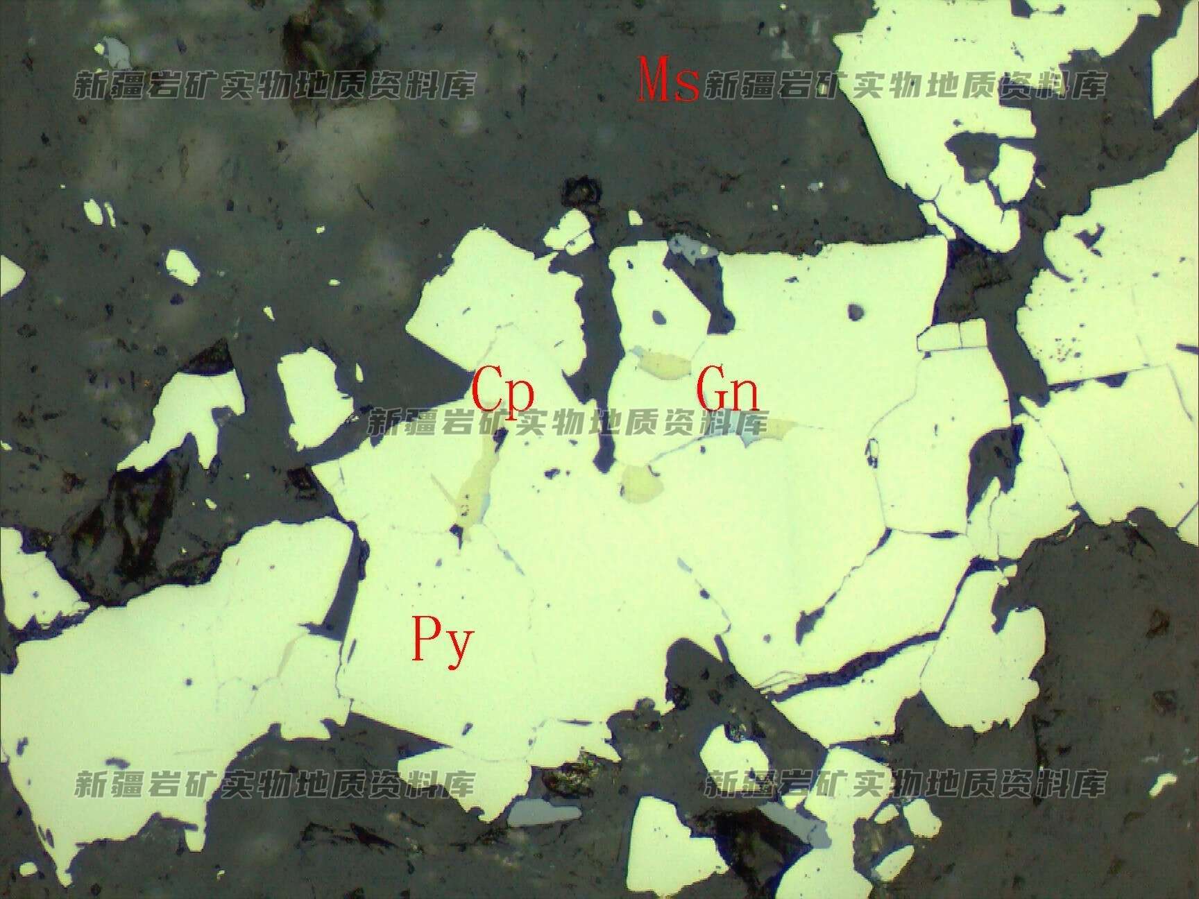 晚阶段同时生成的黄铜矿(Cp)和方铅矿(Gn)分布在早阶段生成的黄铁矿(Py)粒间或裂隙中,Ms为脉石矿物。