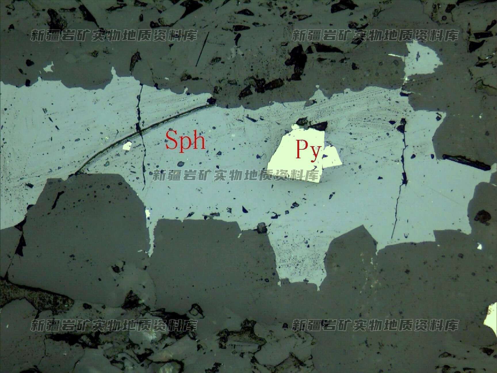 晚阶段形成的闪锌矿(Sph)包含早阶段生成的结晶较完整的黄铁矿(Py)。