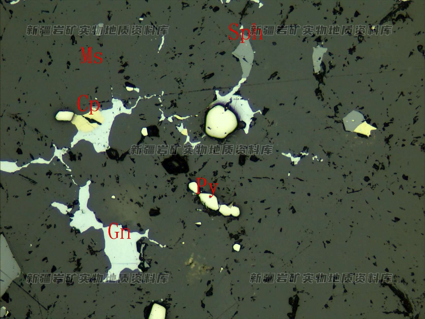 早阶段形成自形粒状黄铁矿(Py),晚阶段形成黄铜矿(Cp)、方铅矿(Gn)及闪锌矿(Sph),分布在脉石矿物(Ms)粒间或裂隙中。