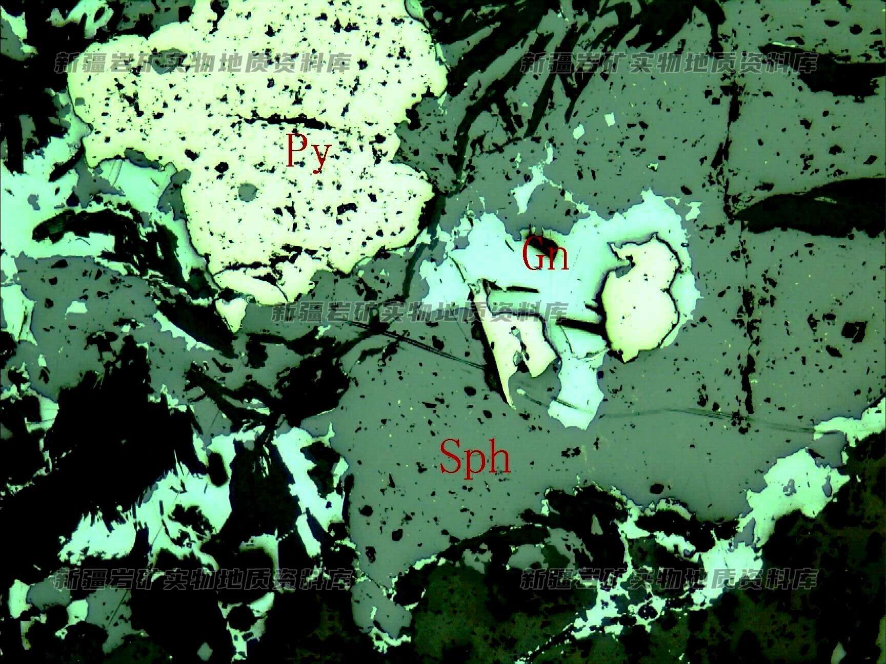 早阶段生成的结晶较好的黄铁矿(Py)被晚阶段生成的闪锌矿(Sph)和方铅矿(Gn)交代,方铅矿又交代闪锌矿。