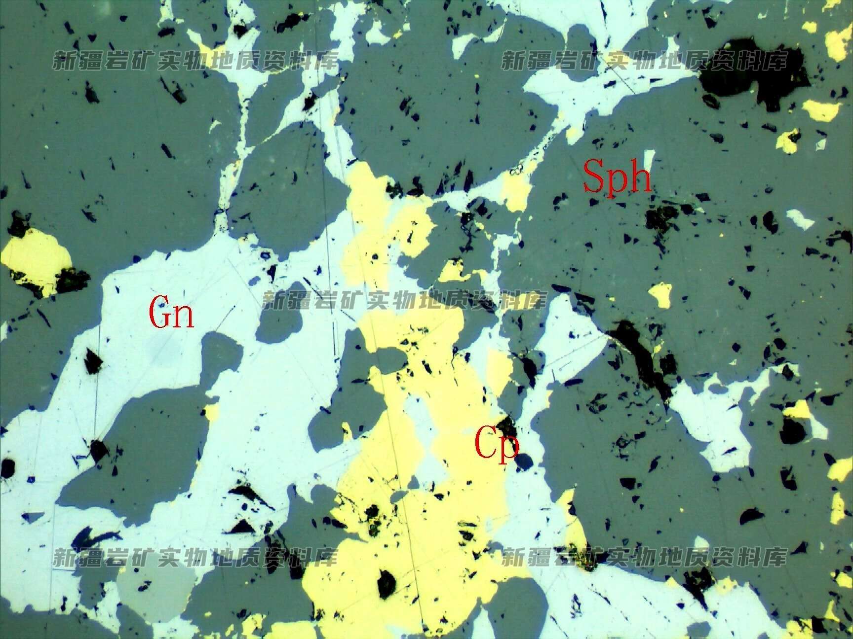 金属硫化物方铅矿(Gn)、黄铜矿(Cp),沿闪锌矿(Sph)裂隙或粒间分布,并交代闪锌矿,形成晚于闪锌矿。