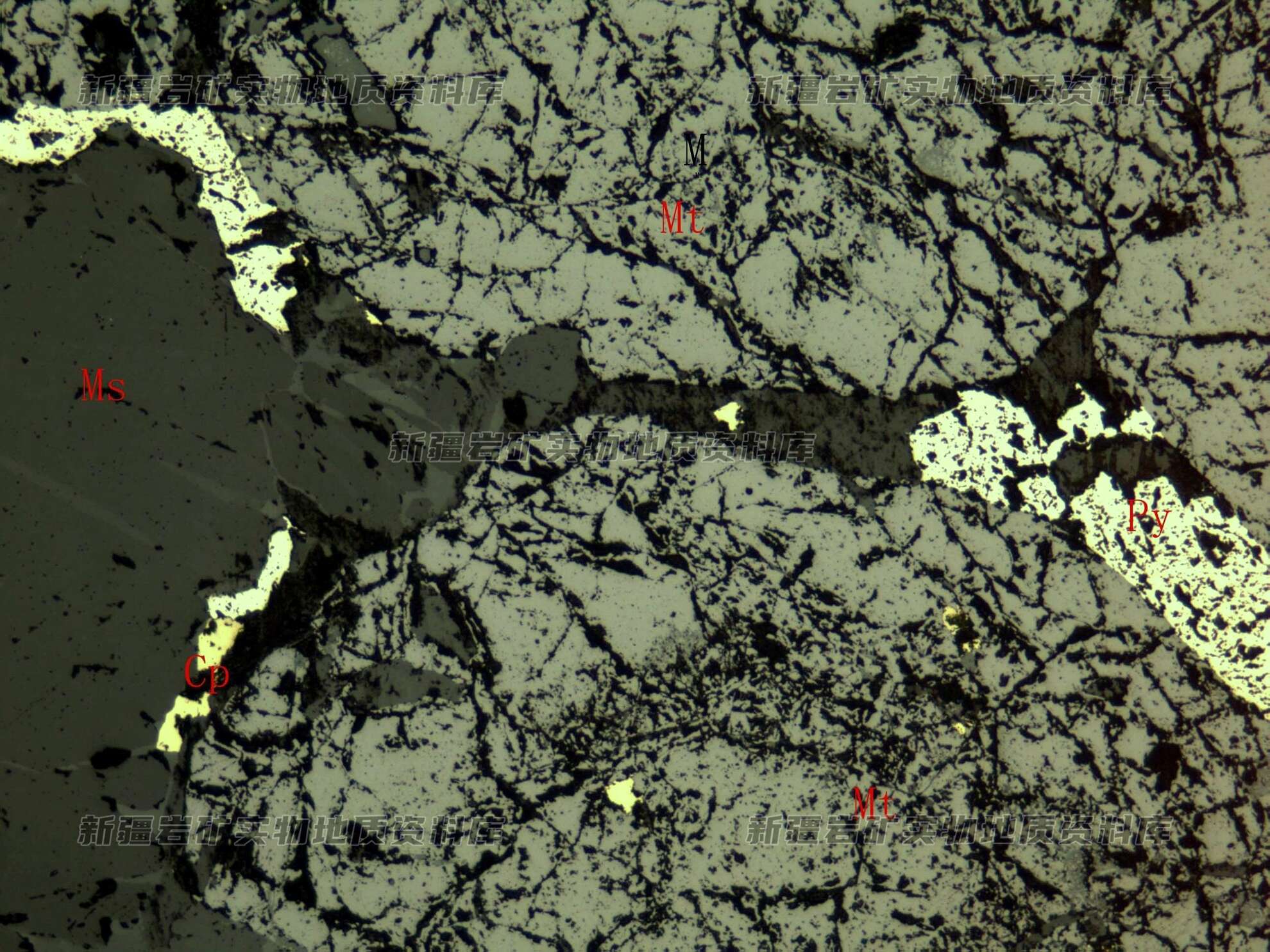 岩石特征描述: 矿石中金属矿物主要为磁铁矿(Mt),次有一些金属硫化物黄铁矿(Py)、黄铜矿(Cp)及磁黄铁矿等,磁铁矿他形粒状集合体,黄铁矿分布在磁铁矿粒间。