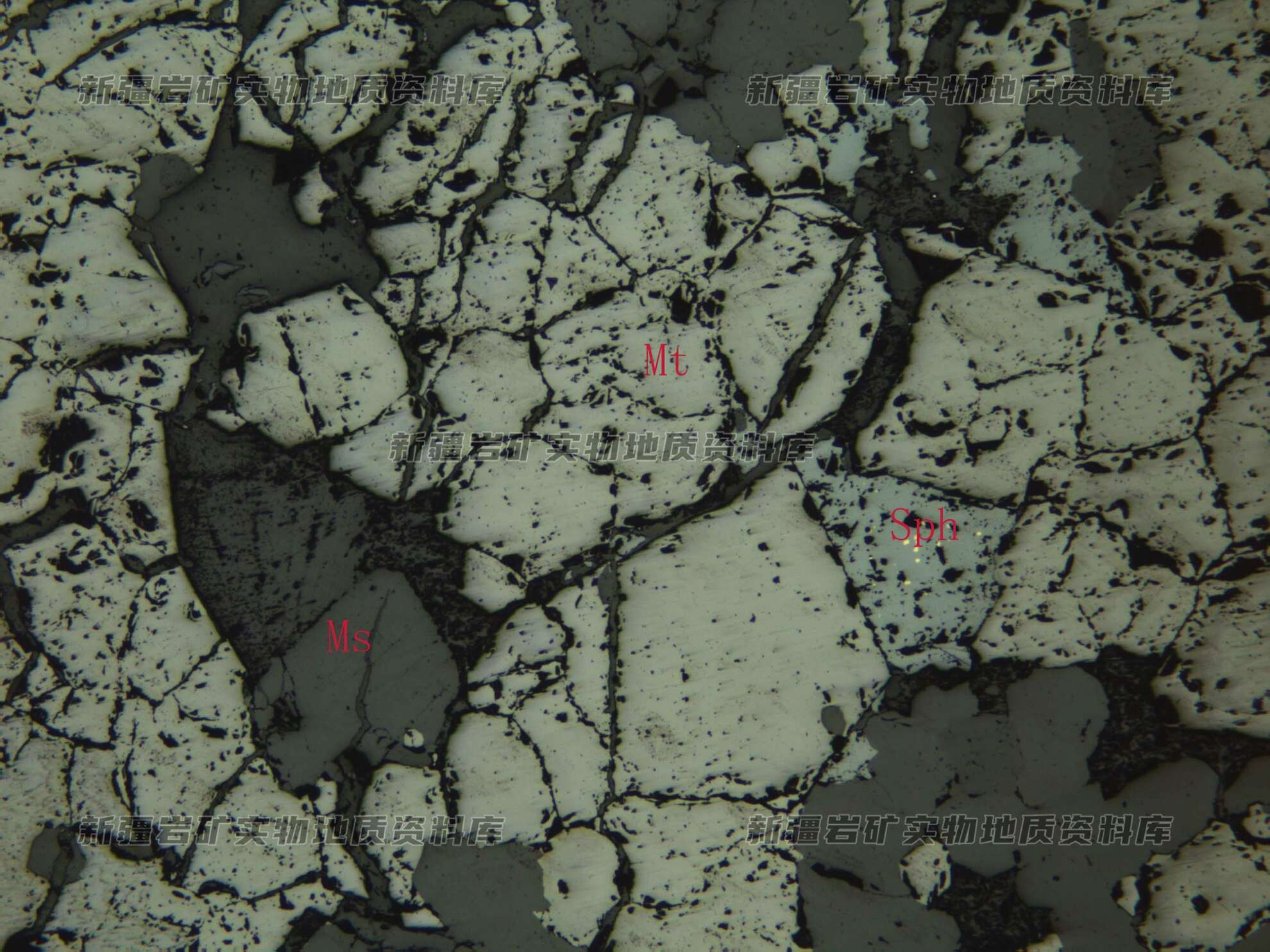 岩石特征描述: 磁铁矿(Mt)半自形-他形粒状集合体分布,其间分布有闪锌矿(Sph)。Ms为脉石矿物。