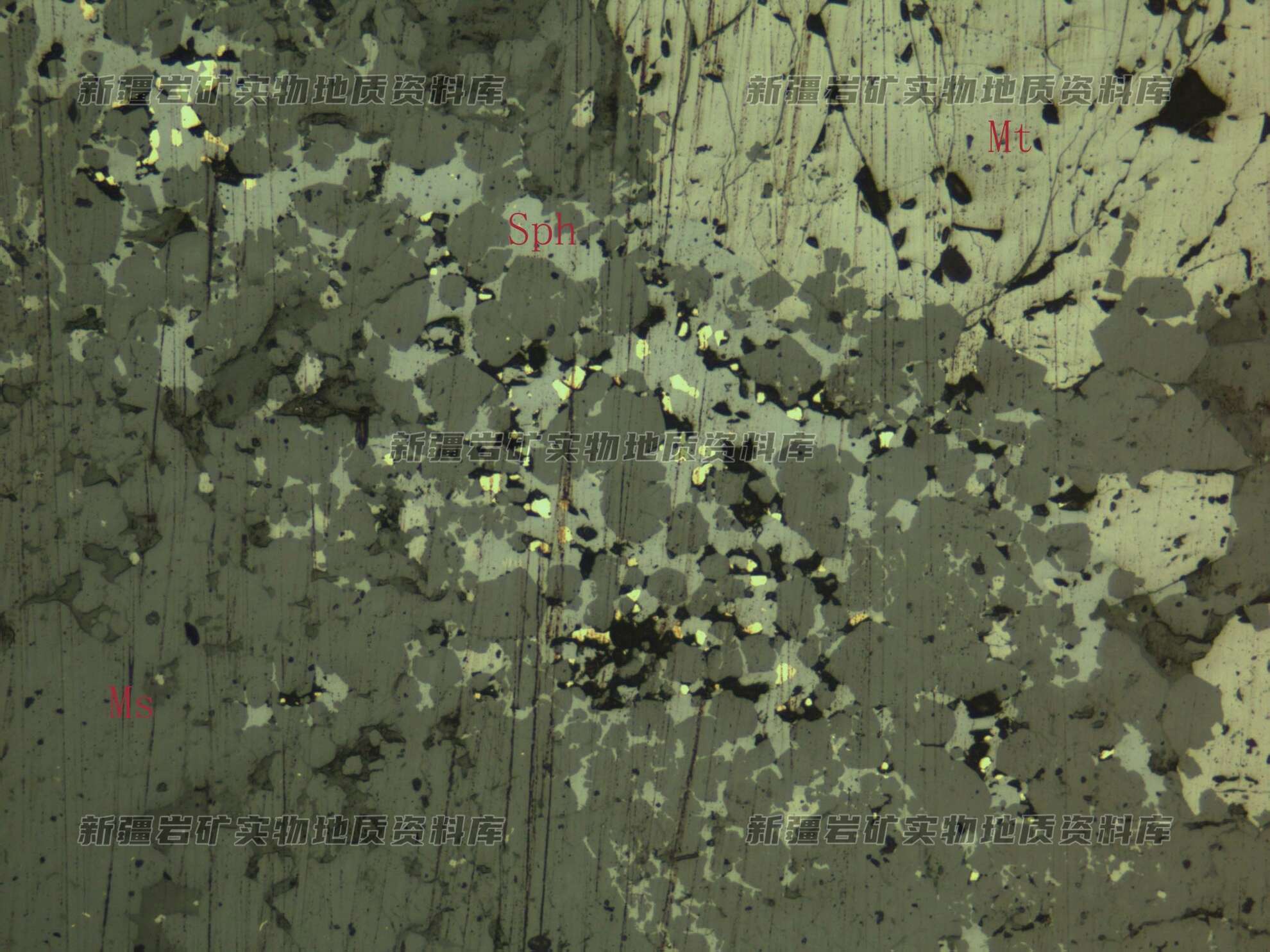 岩石特征描述: 磁黄铁矿(Pyr)细他形粒状,分布在闪锌矿(Sph)中。