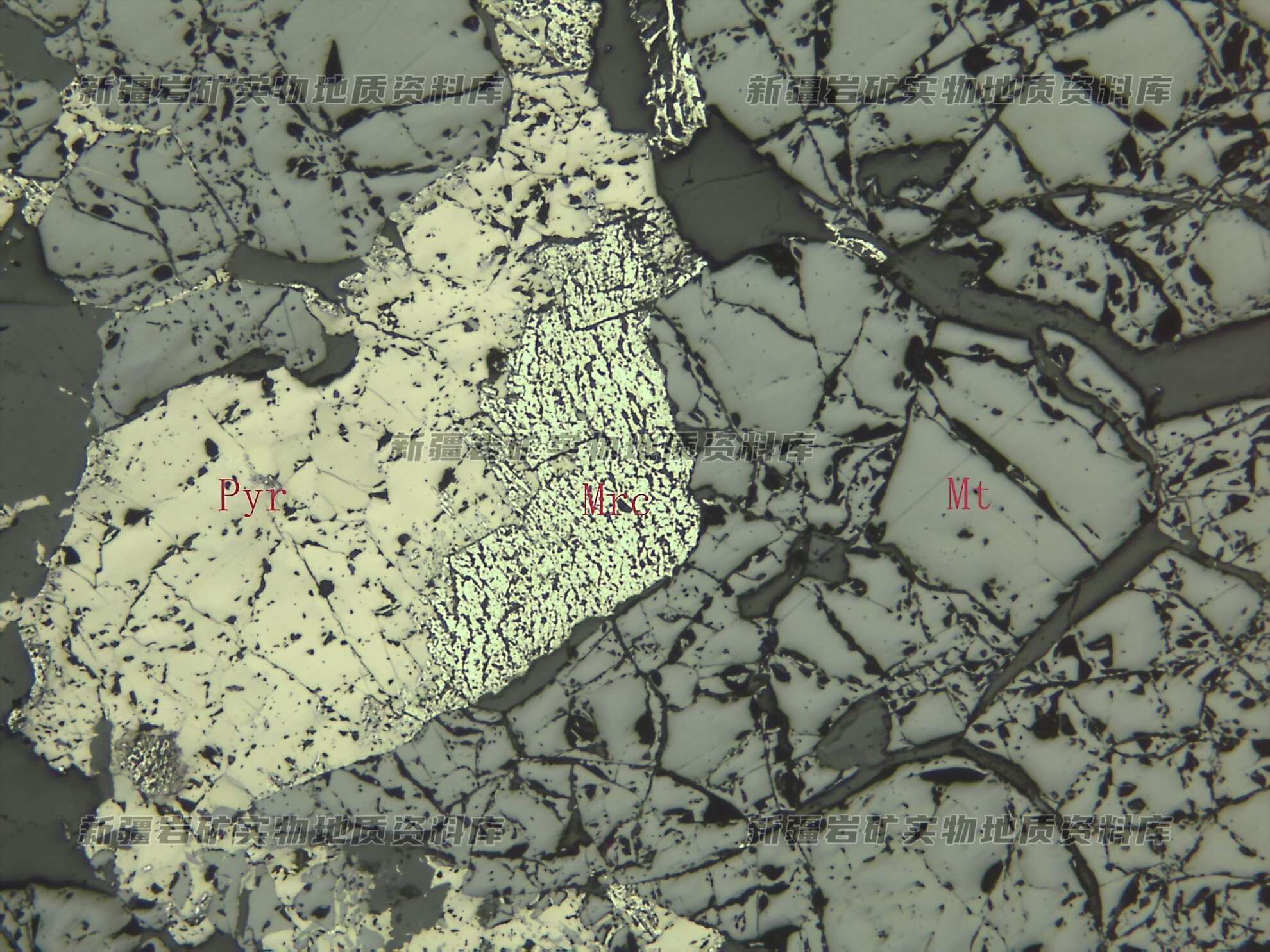 岩石特征描述: 白铁矿(Mrc)交代磁黄铁矿(Pyr),硫化物充填在磁铁矿(Mt)间隙中。