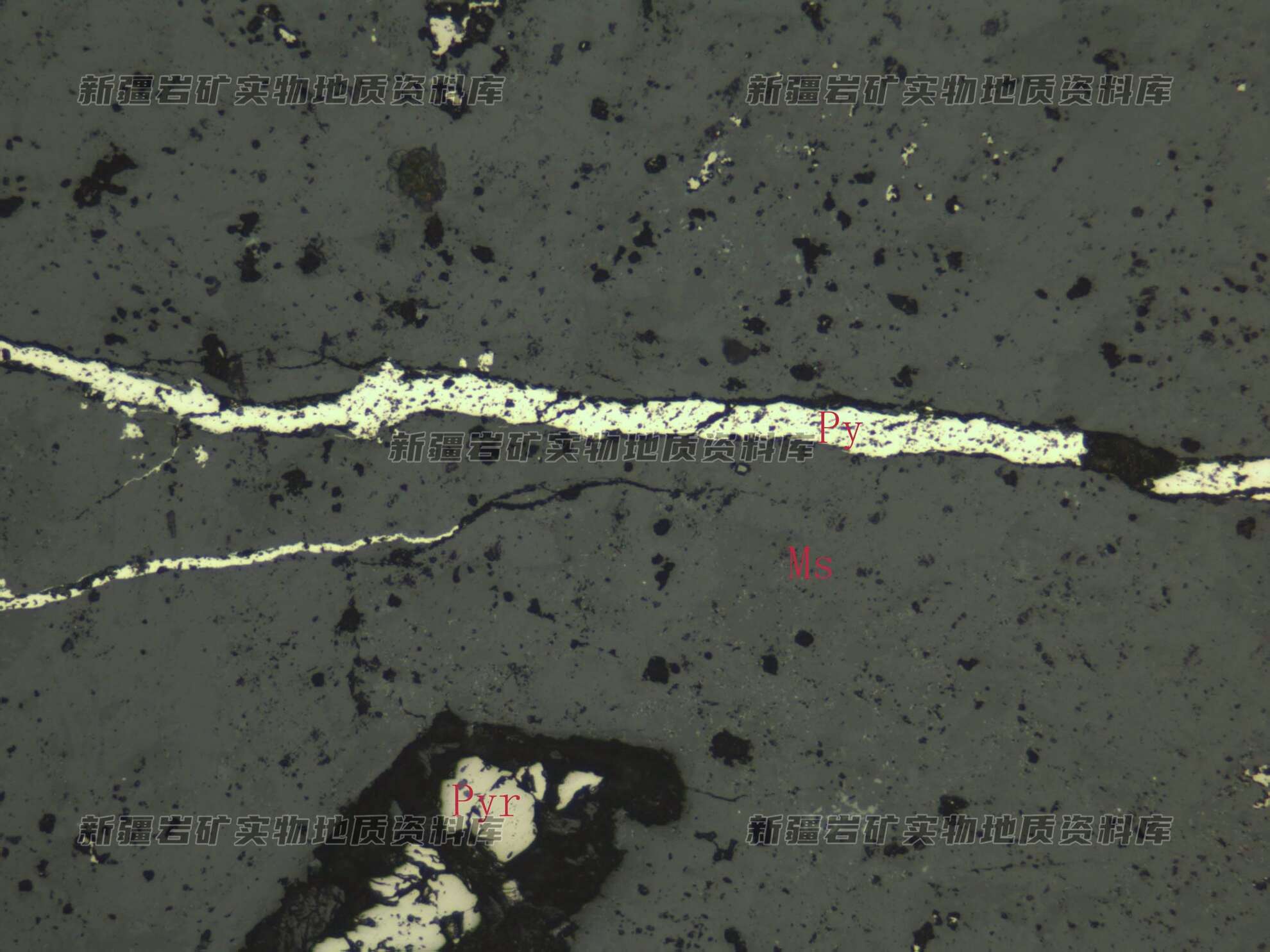岩石特征描述: 金属矿物为磁黄铁矿(Pyr)和黄铁矿(Py),磁黄铁矿他形粒状散布于脉石矿物(MS)之间,黄铁矿呈脉状分布。