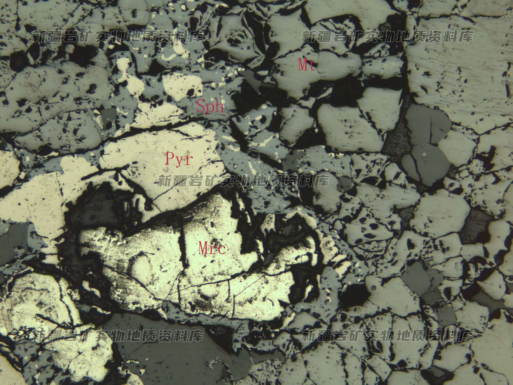 岩石特征描述: 矿石由磁铁矿(Mt)、磁黄铁矿(Pyr)、闪锌矿(Spr)及白铁矿(Mrc)等构成,磁黄铁矿即呈独立单体分布,也包含在闪锌矿中。