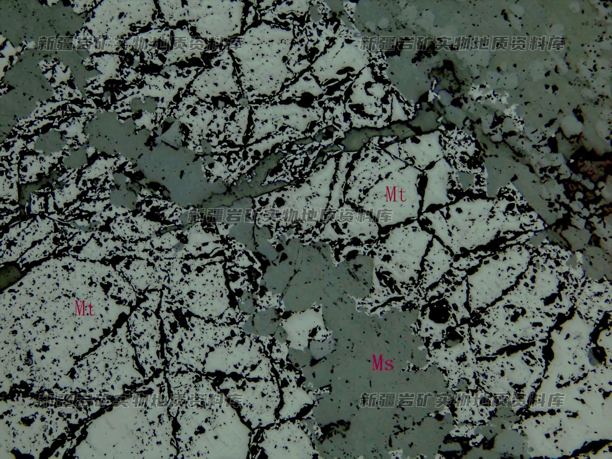 磁铁矿 自形-他形粒状,外形较规则,粒径变化大,在0.02-1.2㎜±,多数在0.2㎜以上,大部分磁铁矿呈规则连生晶镶嵌生长在一起。闪锌矿含量较低,他形粒状,多充填在磁铁矿粒间,内部包含细粒由固溶体分离形成的磁黄铁矿、黄铜矿等。磁黄铁矿镜下不多见,含量低,他形粒状,粒径细,在0.01-0.1㎜,除包含在闪锌矿中外,也独立分布在磁铁矿粒间。黄铜矿含量低,他形粒状,粒径很细,在0.01-0.03㎜,产出方式与磁黄铁矿相同。黄铁矿半自形-他形粒状,分布在磁铁矿之间,被白铁矿交代。