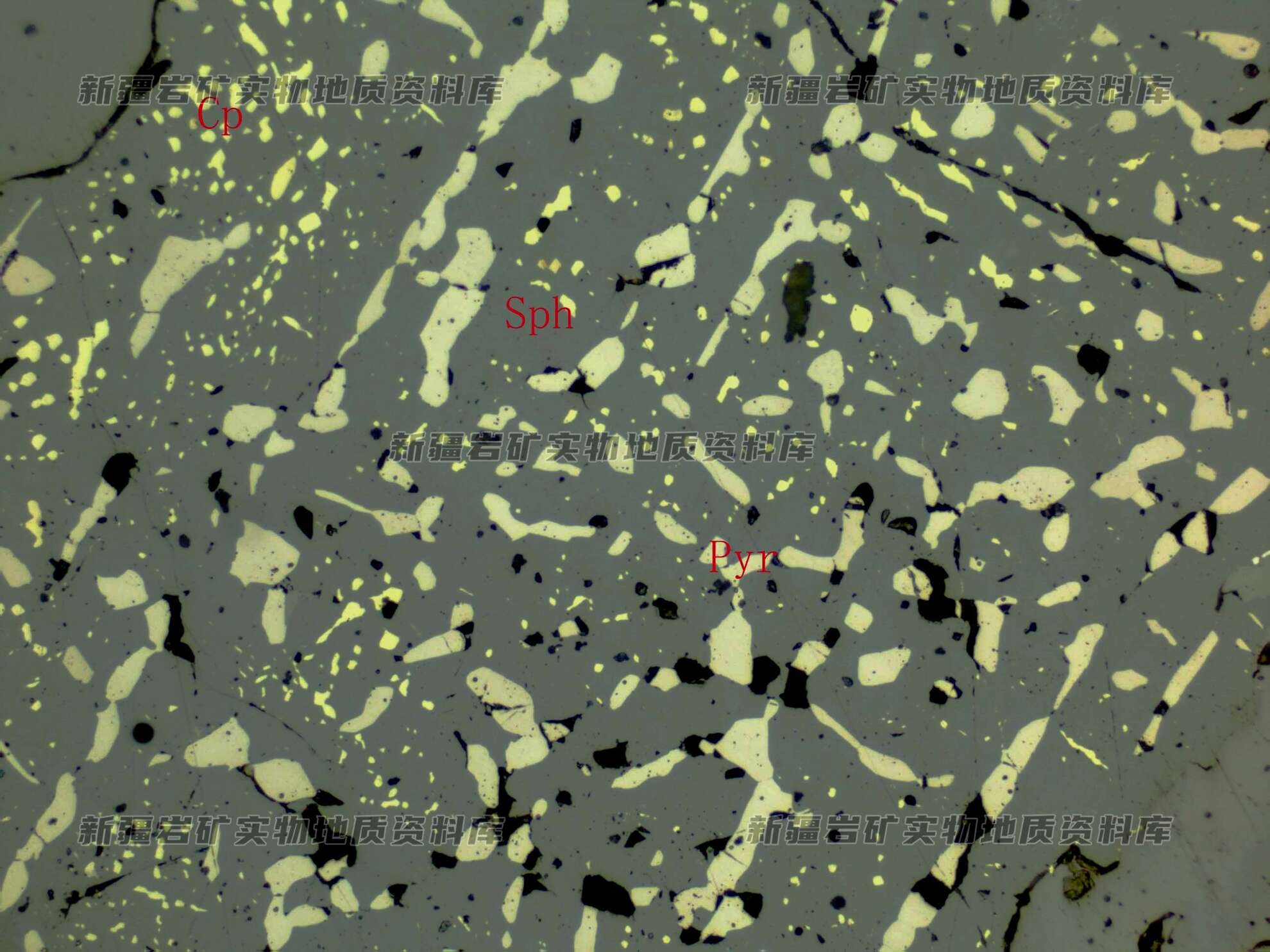 岩石特征描述: 黄铜矿(Cp)呈乳滴状,磁黄铁矿(Pyr)呈细粒-长粒状,规则分布在闪锌矿(Sph)中。