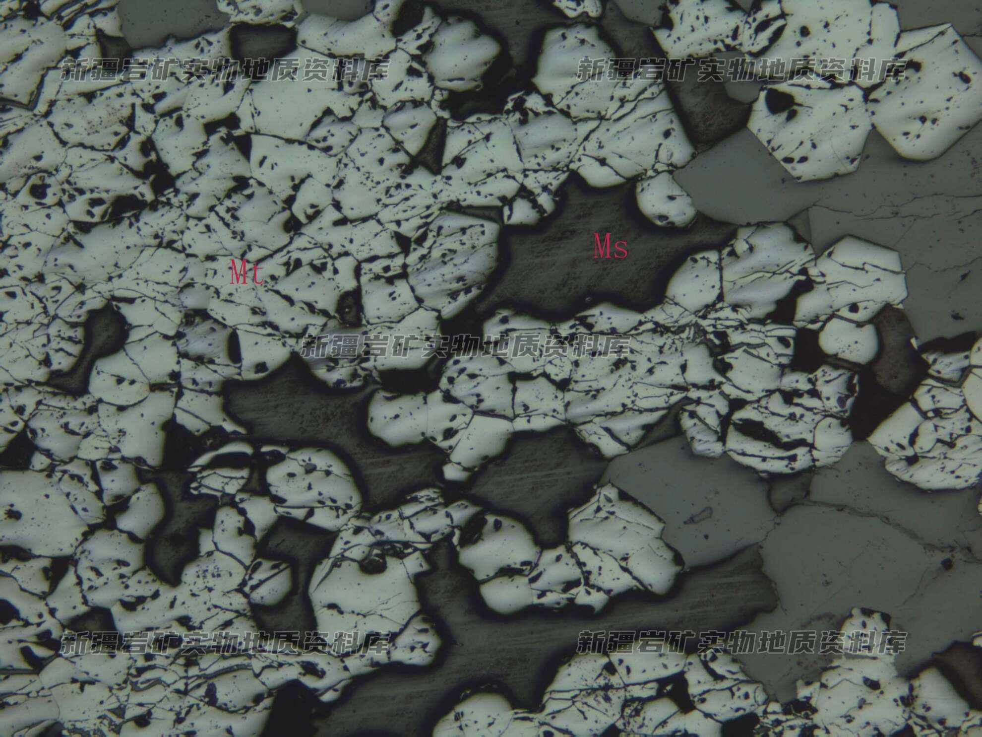岩石特征描述: 金属矿物磁铁矿(Mt)呈半自形粒状分布,彼此紧密连生在一起。