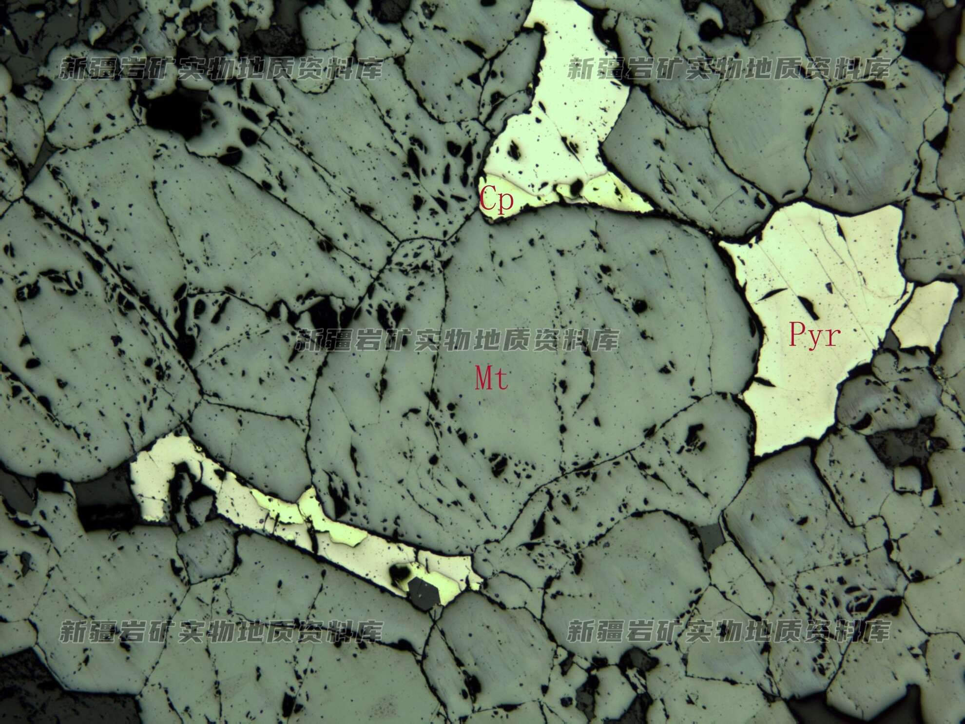 岩石特征描述: 磁铁矿(Mt)呈自形-半自形粒状紧密镶嵌生长在一起,在其间隙中分布磁黄铁矿(Pyr)和黄铜矿(Cp)。