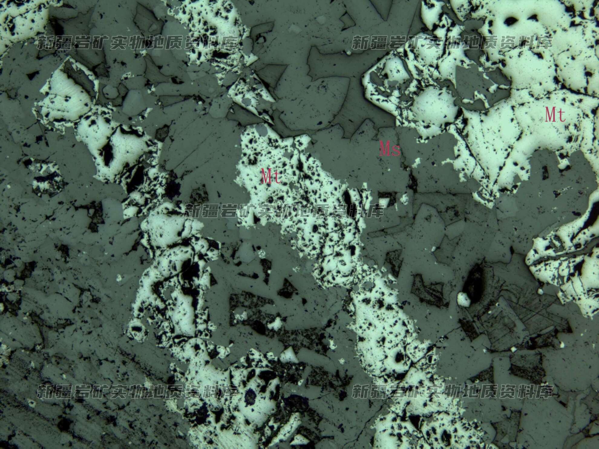 岩石特征描述: 磁铁矿(Mt)呈半自形-他形粒状分布,构成断续的条带产出,Ms为脉石矿物。