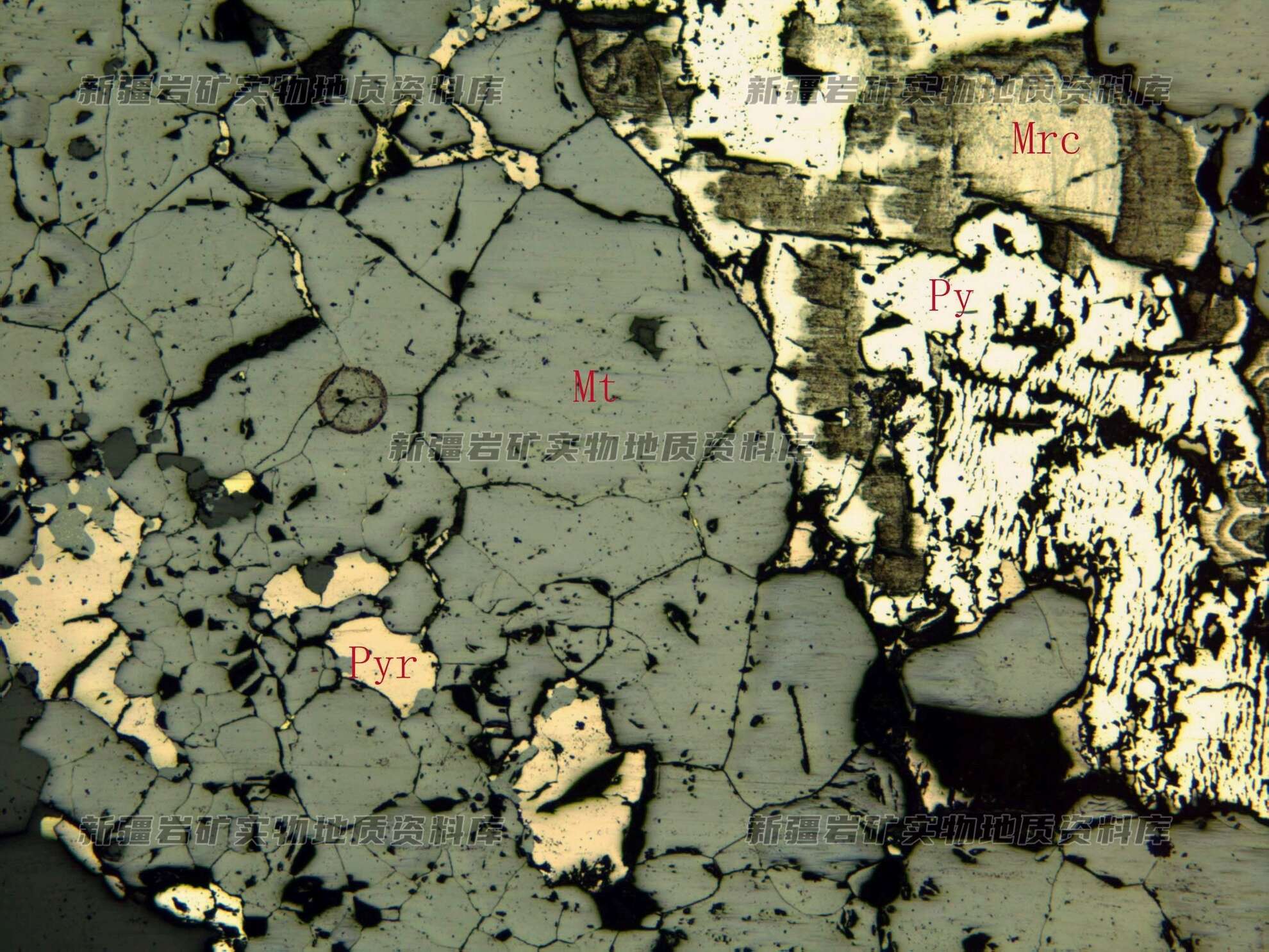岩石特征描述: 磁铁矿(Mt)半自形粒状集合体,磁黄铁矿充填在其粒间,黄铁矿(Py)被白铁矿(Mrc)交代。