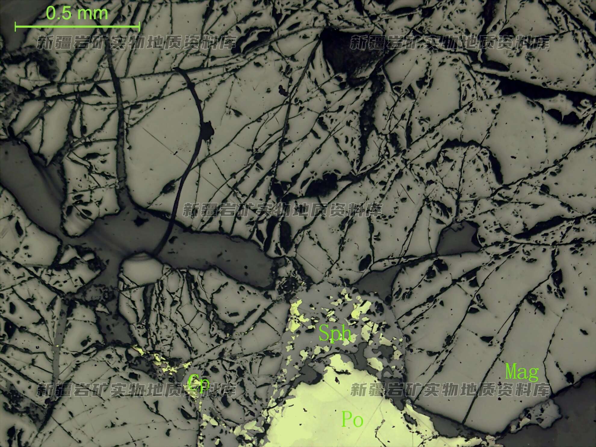 岩石特征描述: 磁铁矿(Mag)自形-半自形粒状,稠密浸染状分布;闪锌矿(Sph)半自形粒状,多交代磁铁矿;在闪锌矿中有固熔体分解的磁黄铁矿(Po),磁黄铁矿半自形粒状,多交代磁铁矿和闪锌矿;黄铜矿(Cp)他形粒状,分布于磁铁矿粒间或与闪锌矿共生。