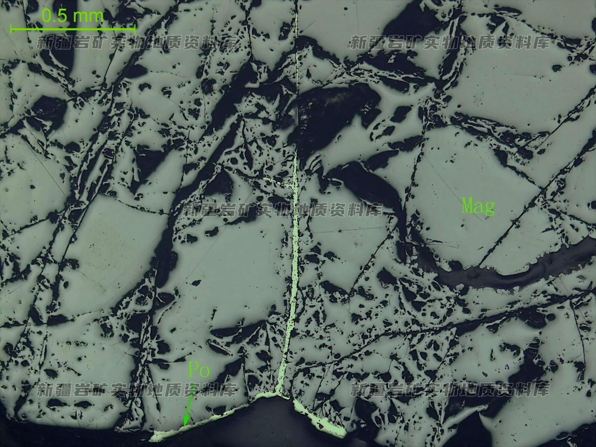 岩石特征描述: 磁铁矿(Mag)半自形粒状,呈稠密浸染状分布,在其间分布粒状磁黄铁矿(Po),沿着磁铁矿边缘和裂隙,见磁黄铁矿呈条带状分布并交代磁铁矿。