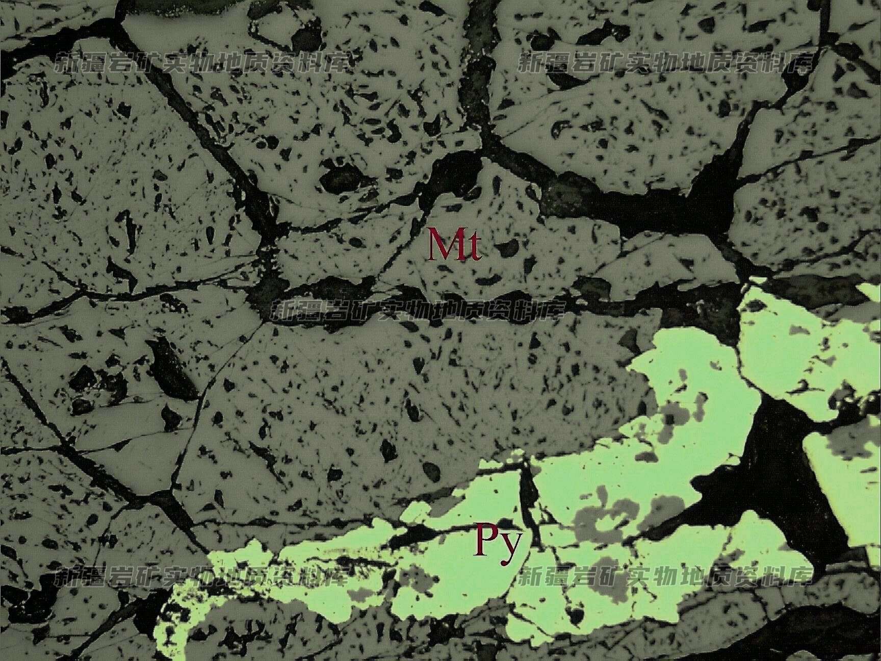 岩石特征描述: 矿石中的主要金属矿物为磁铁矿(Mt),呈半自形—它形粒状分布,并伴有黄铁矿(Py)化,部分黄铁矿被褐铁矿交代。