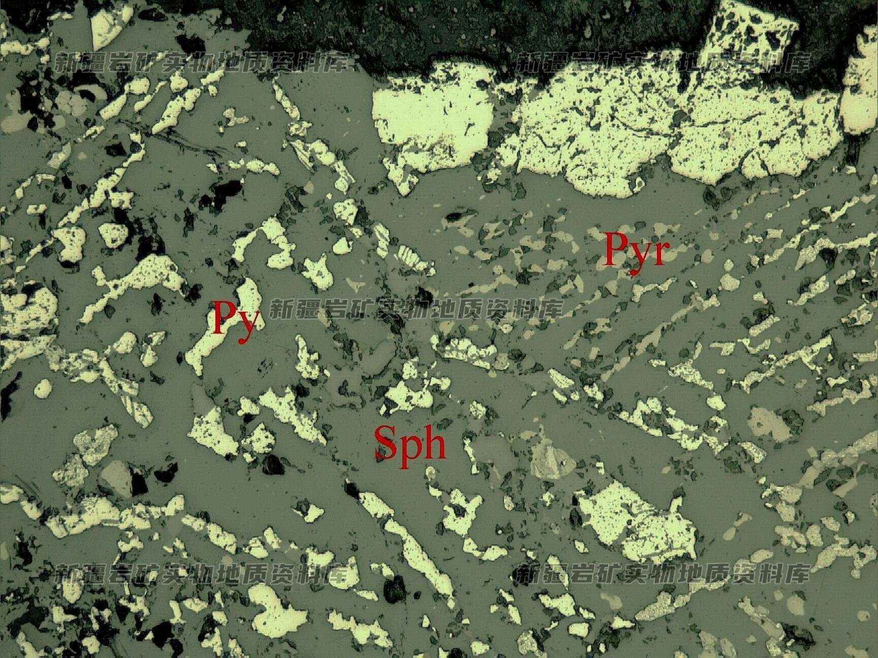 岩石特征描述: 金属矿物多数为磁铁矿,次有少量的铁闪锌矿,铁闪锌矿(Sph)包含细粒黄铁矿(Py)和磁黄铁矿(Pyr)。