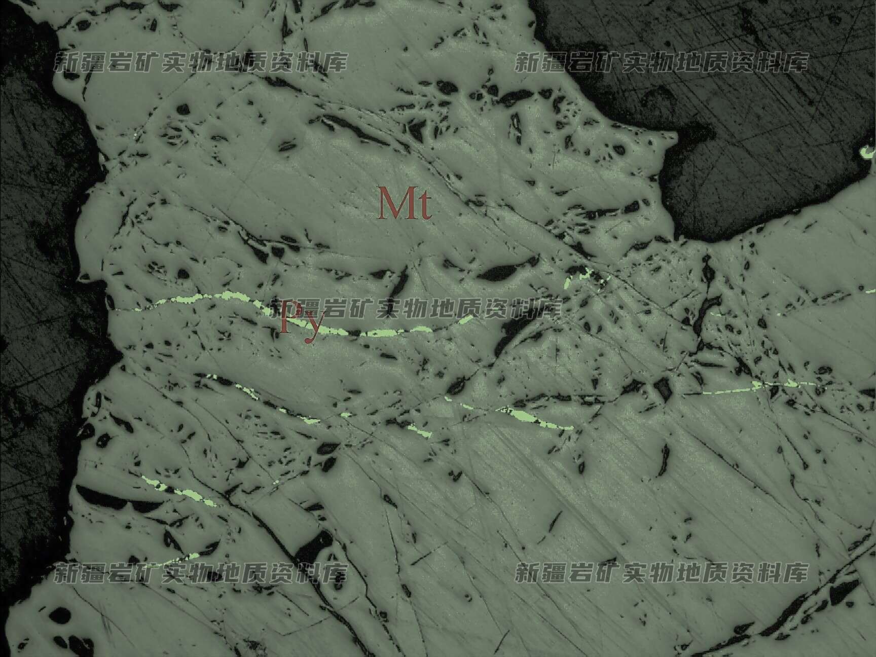 岩石特征描述: 磁铁矿(Mt)呈紧密相连的集合体产出,沿裂隙充填细脉黄铁矿(Py)。Ms为脉石矿物。