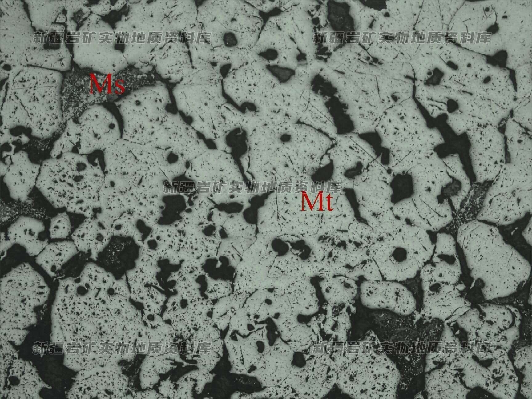 岩石特征描述: 磁铁矿(Mt)他形—半自形粒状,呈彼此相连的集合体分布,其粒间充填脉石矿物(Ms)。