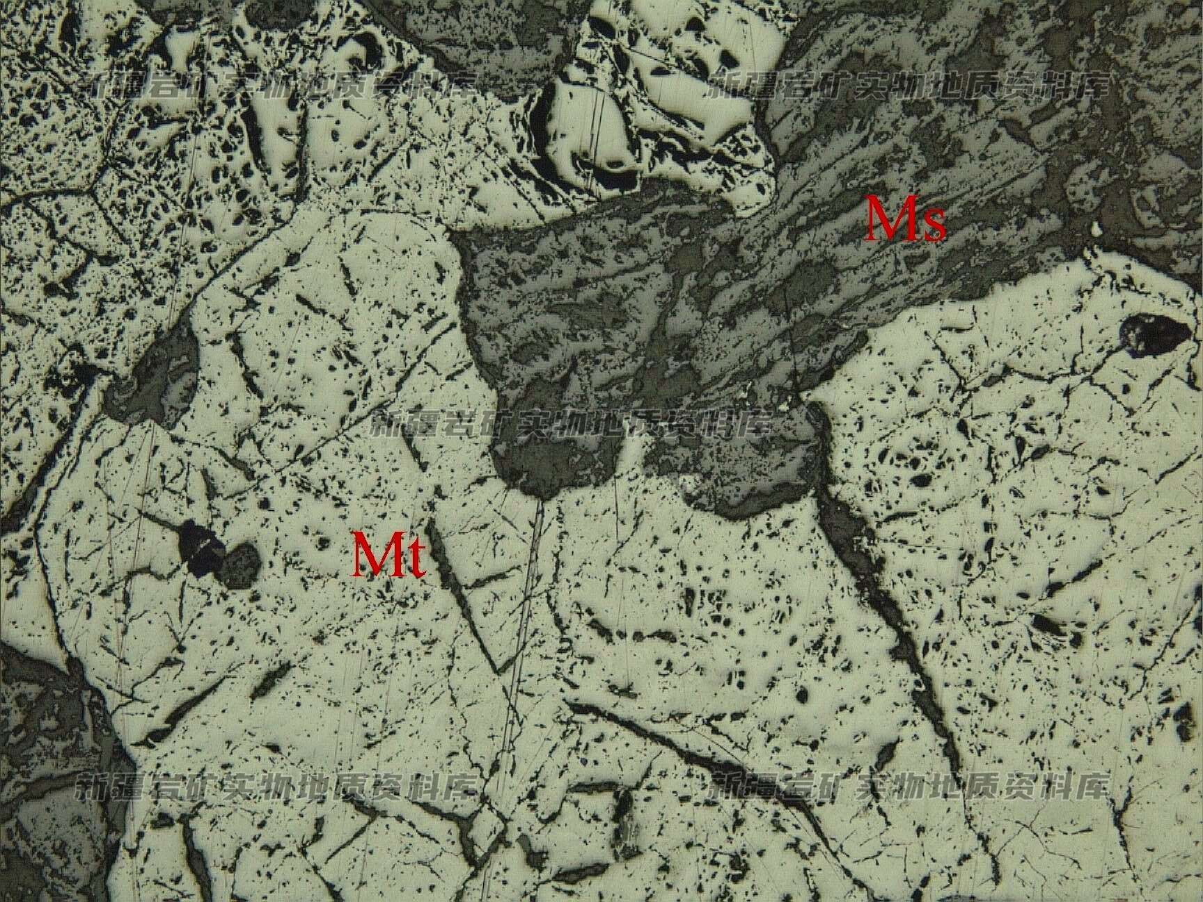 岩石特征描述: 磁铁矿(Mt)呈彼此相连的集合体或单体状分布,其间分布脉石矿物(Ms)。