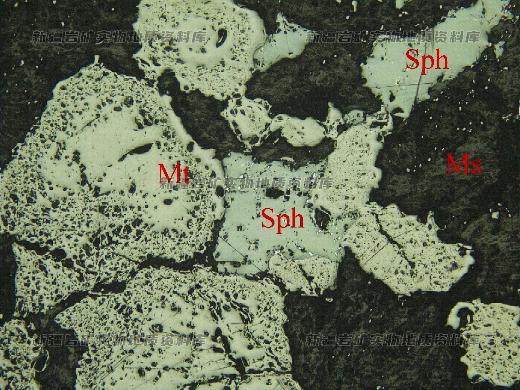 岩石特征描述: 磁铁矿(Mt)呈他形粒状不均匀分布,在其粒间分布铁闪锌矿(Sph)。Ms为脉石矿物。