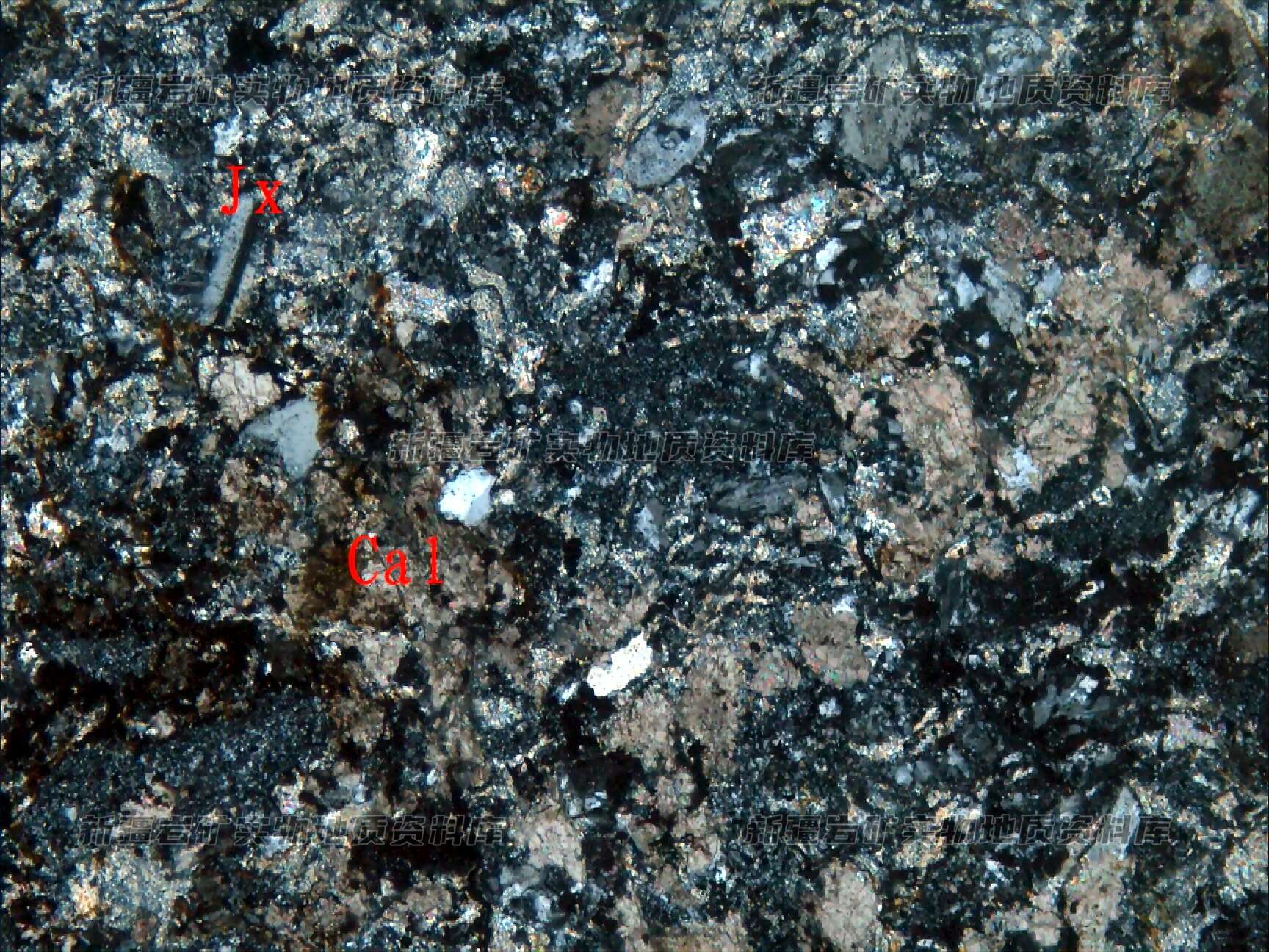 岩石特征描述: 岩石已强烈次生蚀变,大部分矿物被绢云母和方解石(Cal)交代,仅少量斜长石、石英(J(+))被保留。