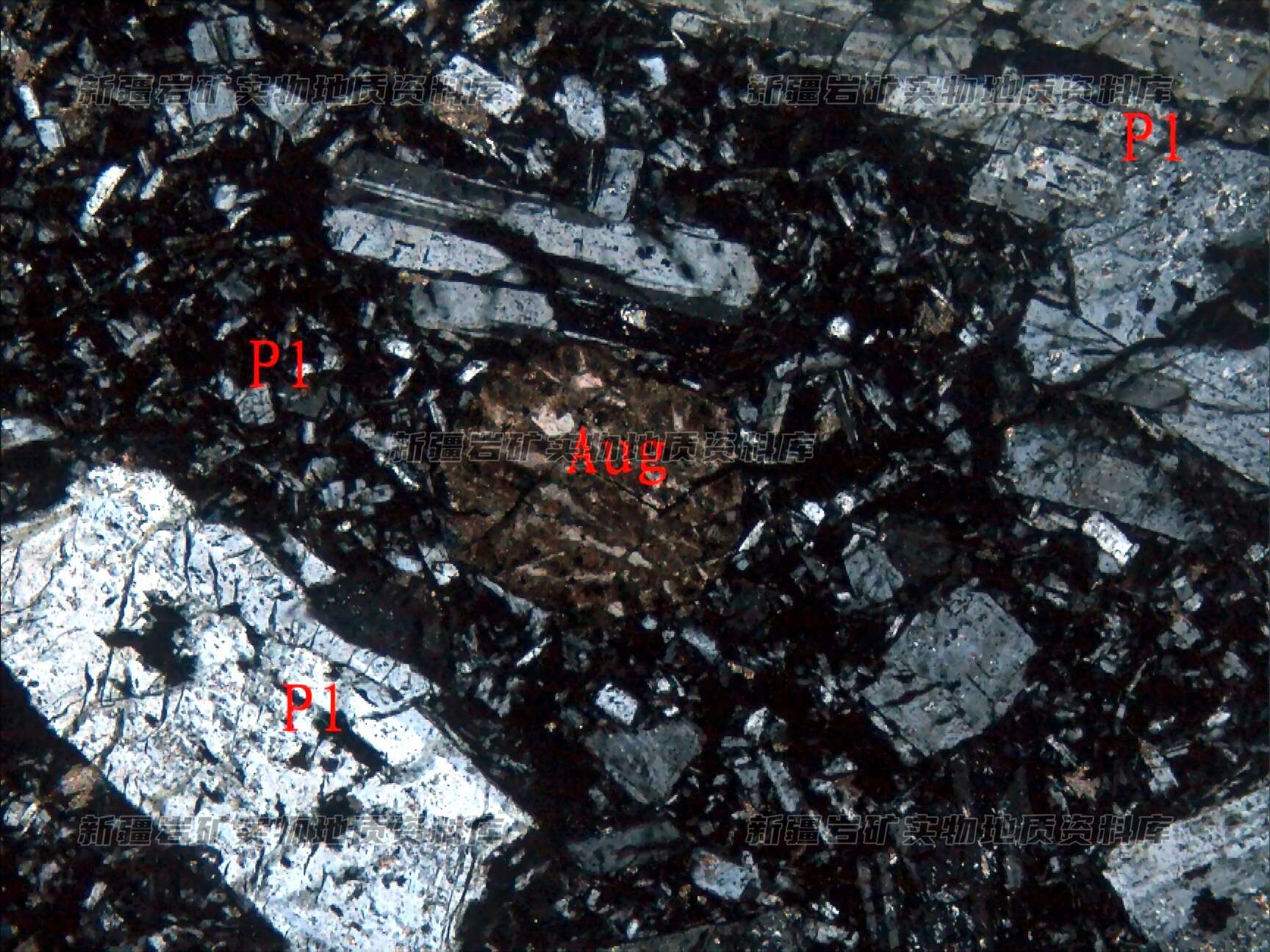 岩石特征描述: 斑晶为斜长石(Pl)、辉石(Aug),后者蚀变为方解石或绿泥石,基质由杂乱分布的板条状斜长石(Pl)和绿泥石构成。
